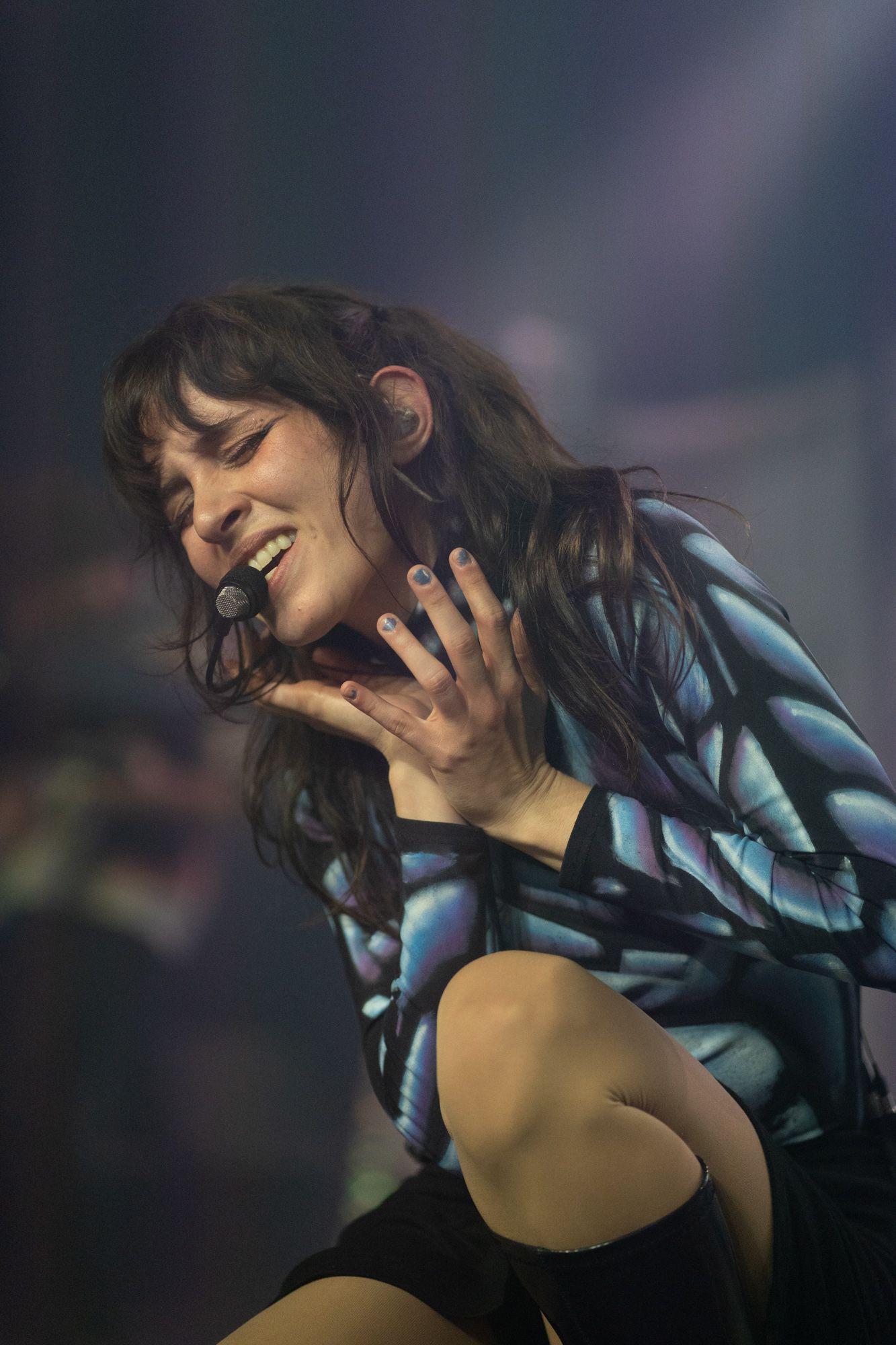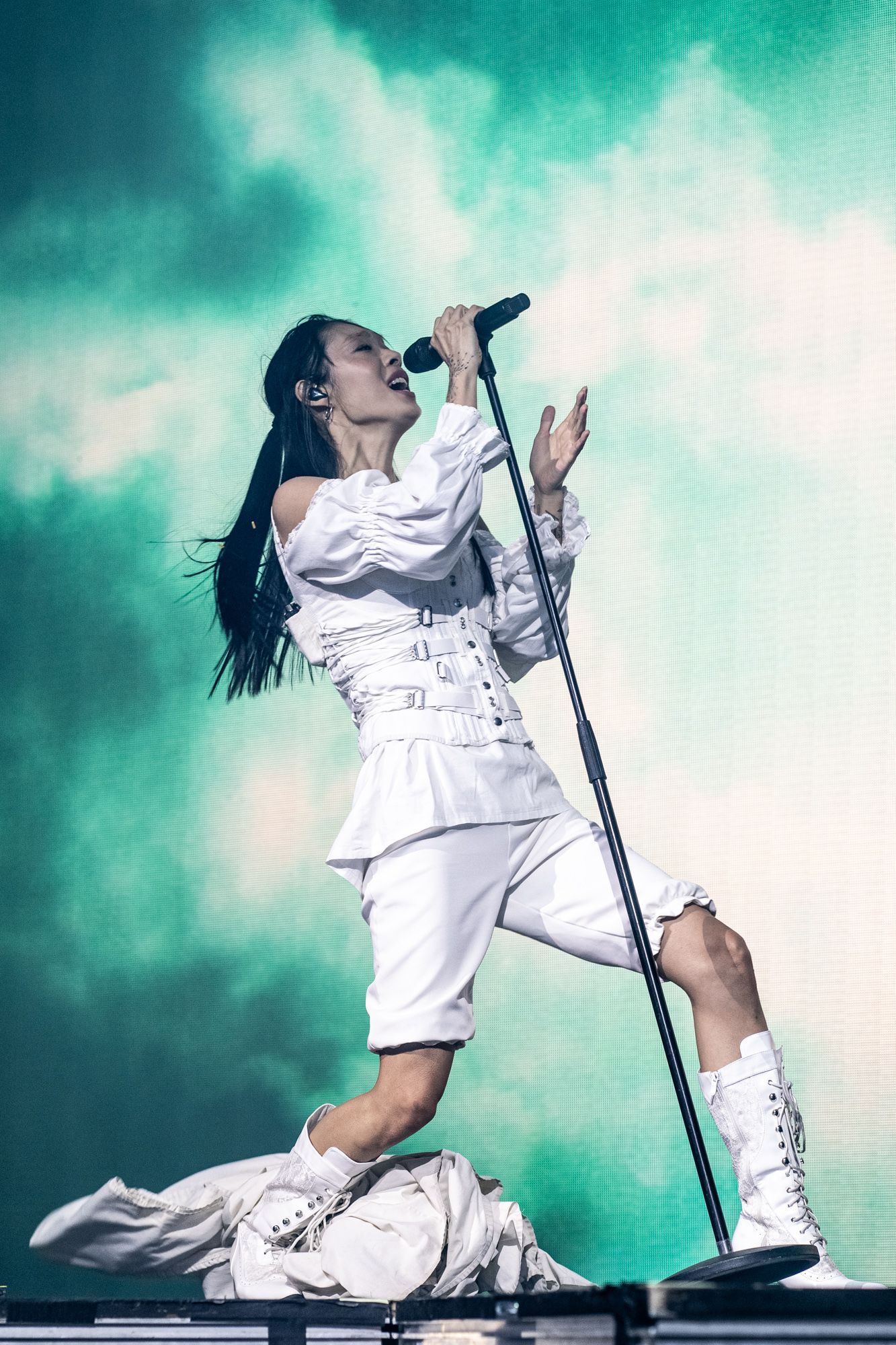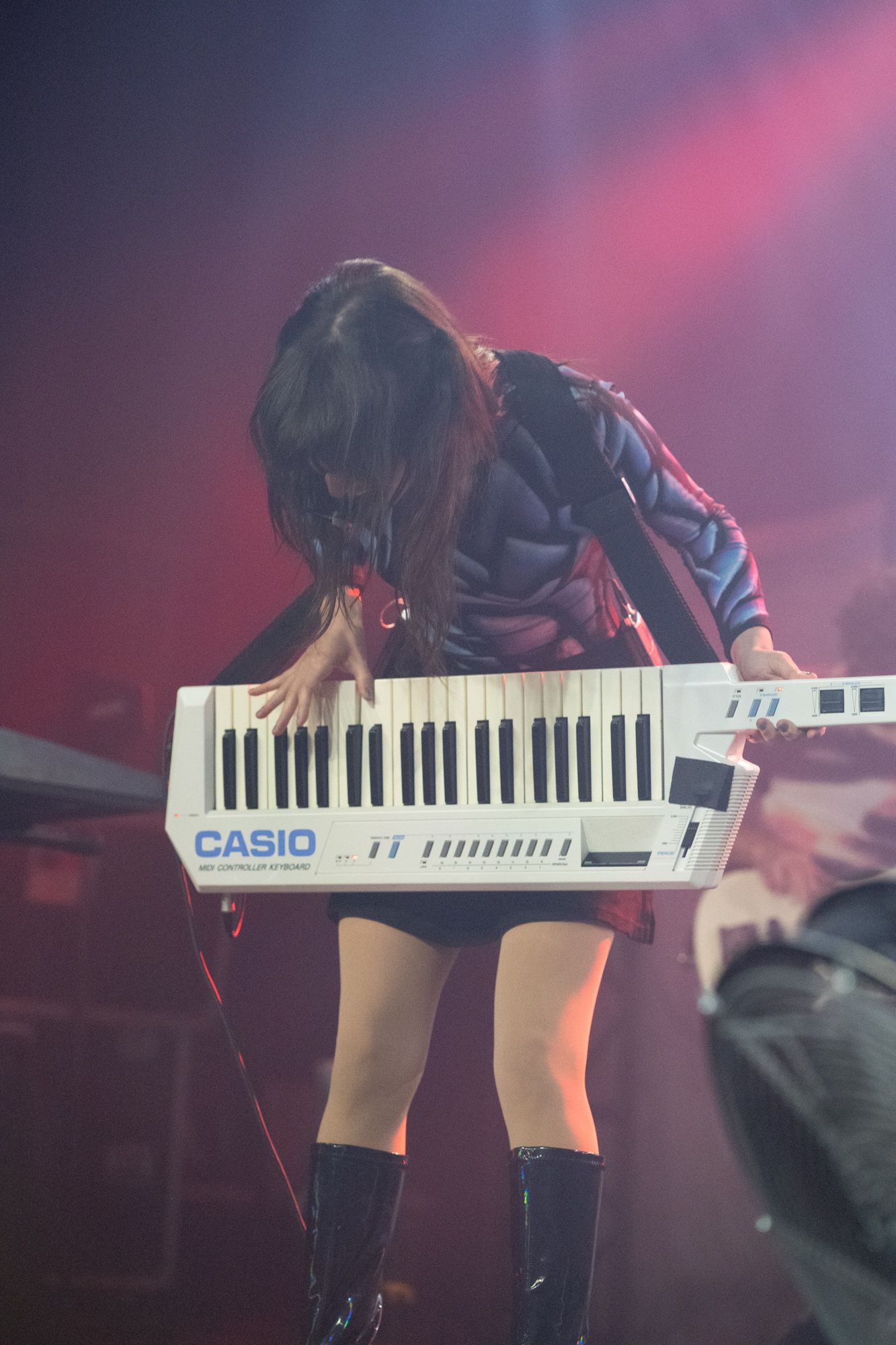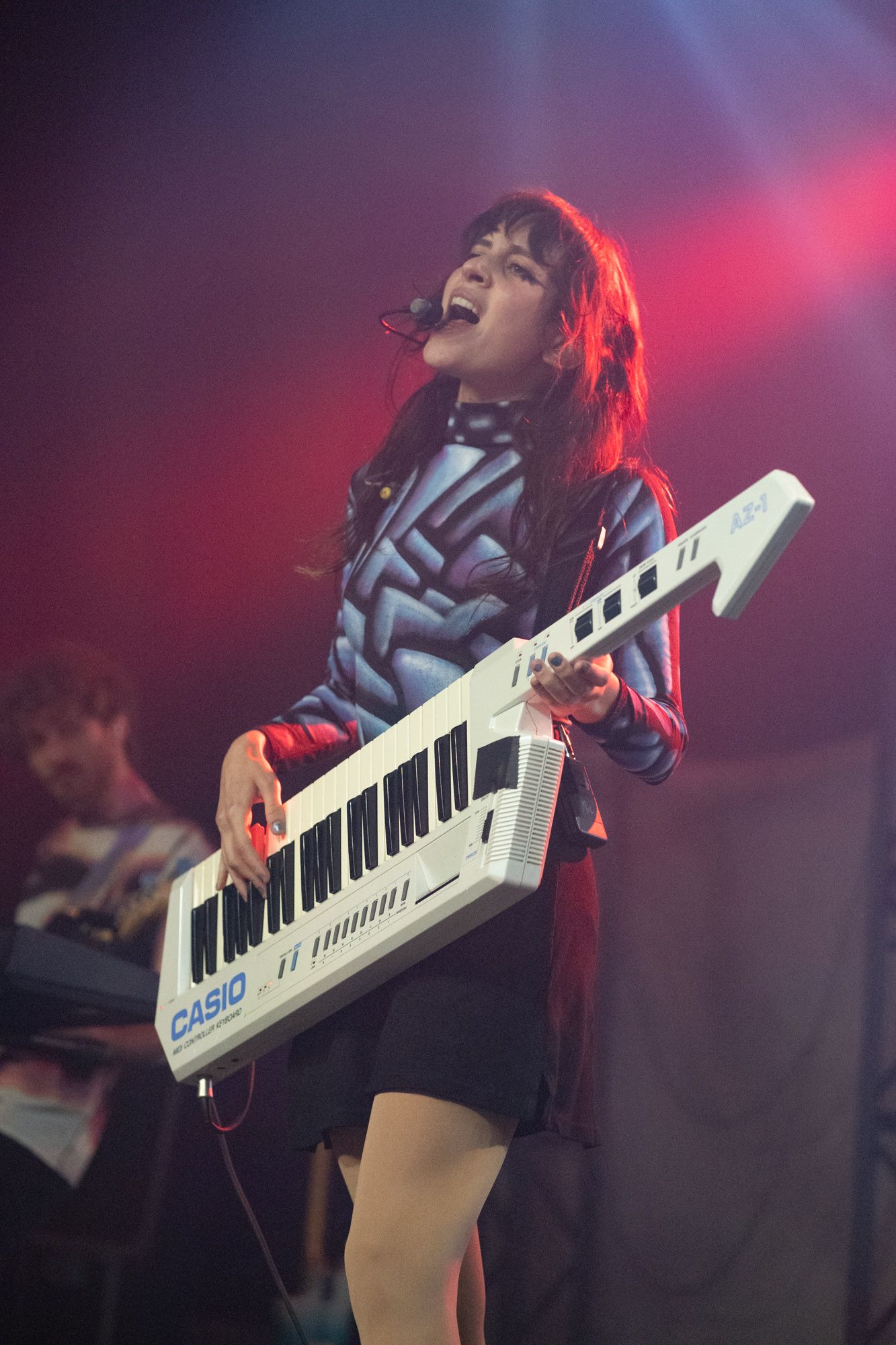 Midway through the set, Mica picked up her white keytar, dancing her way across the stage, playing out chords and matching melodies with Matthew on his guitar. One thing I always love about performances is when an artist brings out a keytar. From my personal experience, this isn’t something I have seen a lot of artists use on stage. As the duo continued, there was no lull or pause in their work; they continued wowing the crowd and getting them grooving to every beat. The pair closed their set out with their song “The Beginning.” The lyrics “Sit back, enjoy the show” echoed from Mica as Matthew played one last keyboard solo with an 80s-style synth, and with a bow, they thanked the crowd and exited the stage in preparation for Rina Sawayama.