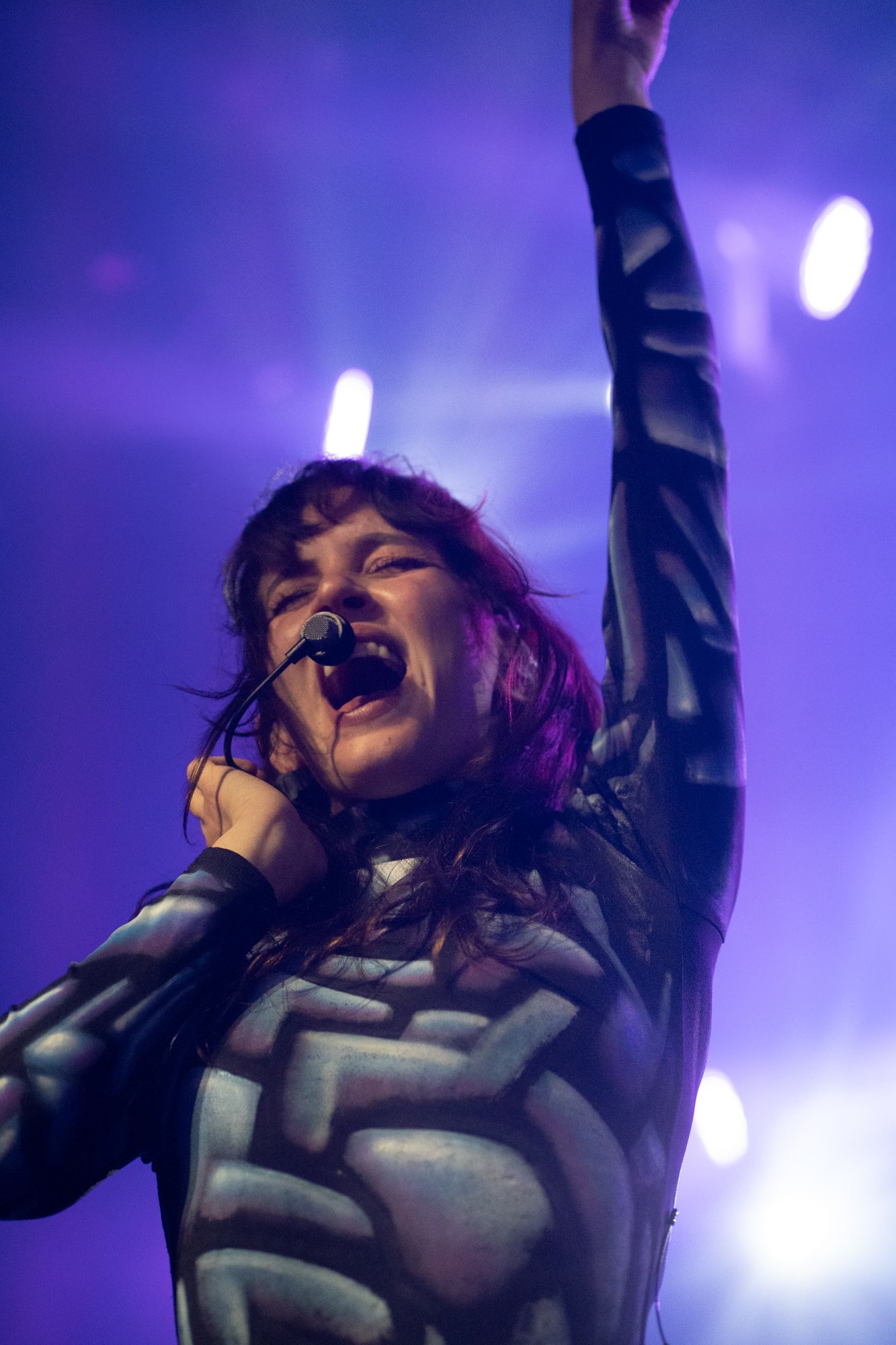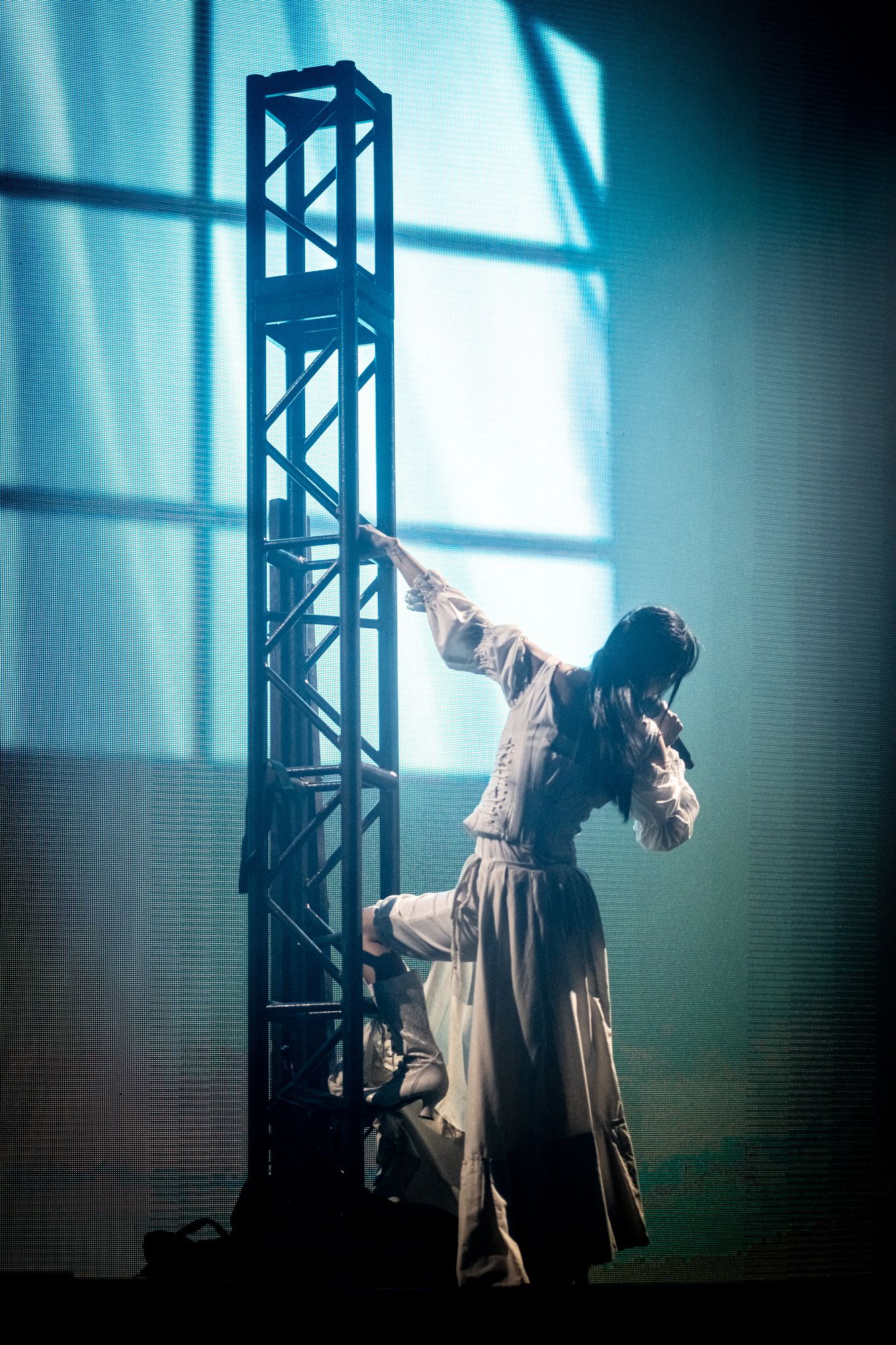 The stage was dark; you could only see the silhouette of Rina Sawayama as she came out on stage, as a very hypnotizing introduction video started playing on the backdrop screen. The video ended, and Rina began singing the intro to her opening song, “Hold the Girl.” Standing on stage, Rina wore a white dress, the top adorned with belts and many buttons. Similar to the “Hold the Girl” music video, where Rina is trying to escape a house but somehow always ends up back in the room she started in, she reenacts the element of escapism with a perplexed look on her face as her backup dancers keep pulling her back. The first act continued, lights flashing to match the storm clouds and lightning on the backdrop, and a surprise to the crowd as Rina rips off the bottom part of her dress to reveal a different variant to this outfit. The first act finishes with the song “Hurricanes” as Rina slips away, leading into the first interlude of the night.