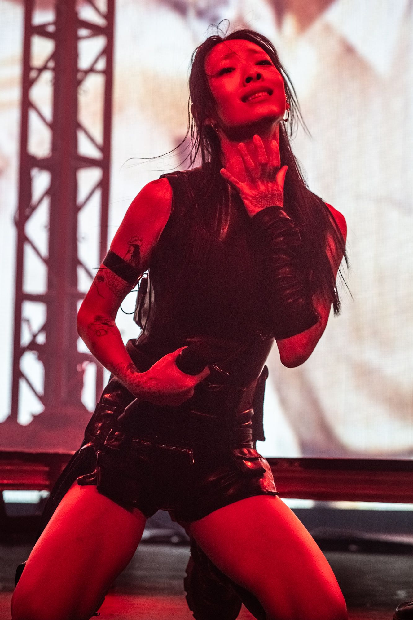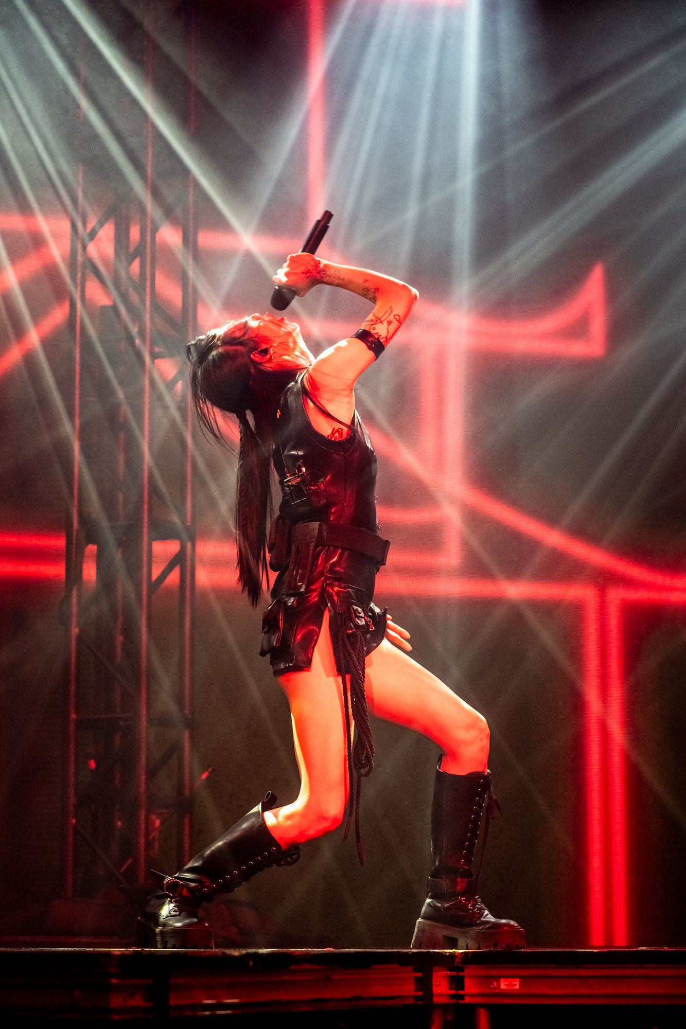 Once the interlude concludes, Rina’s backup dancers return to the stage, the lights flashing incredibly fast, making their dance moves look like they were from a Tim Burton stop-motion film. They danced in tandem as solid drumbeats punched the air. Rina returned on stage dressed in a black latex outfit and went straight into her song “Dynasty,” which, among my friends, is a definite favorite. Moving on from the melancholy stormy vibe of the first act, we transition to a darker theme, lit up by red lights; the second act includes heavier sounding songs like “Akasaka Sad,” “STFU!” and personally my favorite piece of hers, “Frankenstein.”
