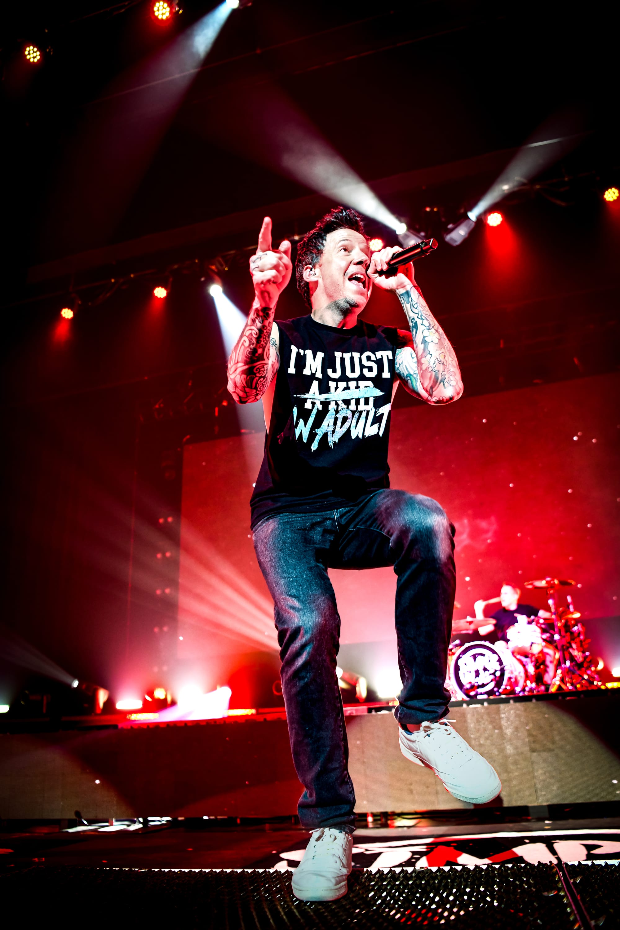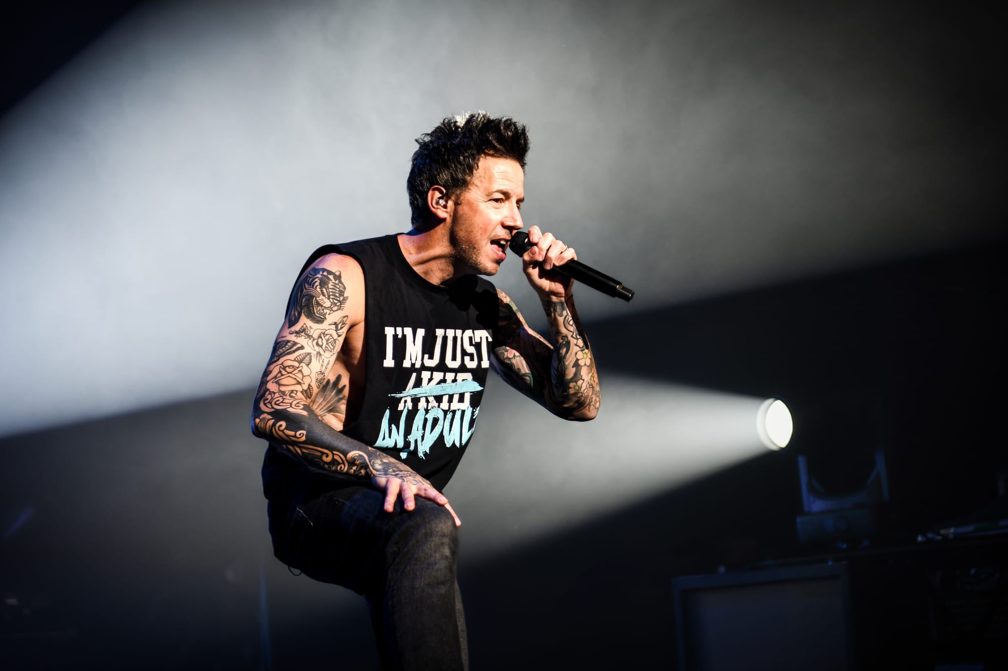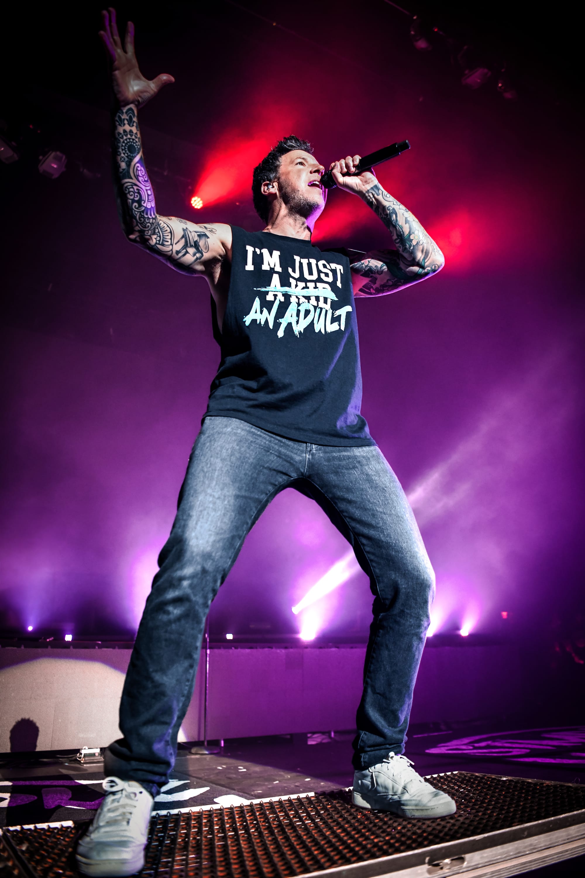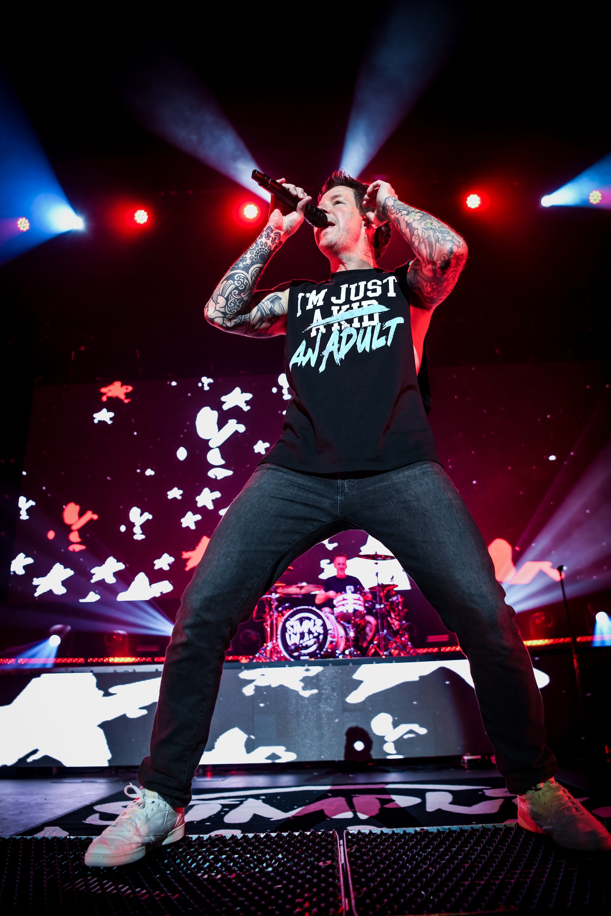 Pierre returned to the main stage for a medley of “The Worst Day Ever,” “My Alien,” “God Must Hate Me,” “Grow Up,” and “Vacation,” before immediately moving into another medley of covers, which included “All Star,” “Sk8er Boi,” and “Mr. Brightside.” For “What’s New Scooby Doo?,” the band invited all fans who had dressed the part to the stage for a giant dance party. Approximately 30 fans who, despite the unbearable Phoenix heat, donned Scooby Doo onesies, as well as a few men who were dressed in Velma’s garb, poured over the barricade, some crowdsurfing to the stage, to join Simple Plan for the iconic song. The set ended with “Where I Belong” before the band returned to the stage for another medley of songs, this time including “Crazy,” “Perfect World,” “Save You,” and “This Song Saved My Life.” Pierre thanked fans who, after all these years, proved to their parents that, in fact, “it was never a phase!” by continuing to support the band. Images of the band as children appeared on the screen as they played through “I’m Just a Kid” before officially ending the nostalgic night with a heartfelt performance of “Perfect.” Fans held up their flashlights, some crying, as they sang along to that final song, thinking about how it felt to try to live up to their parents' expectations.