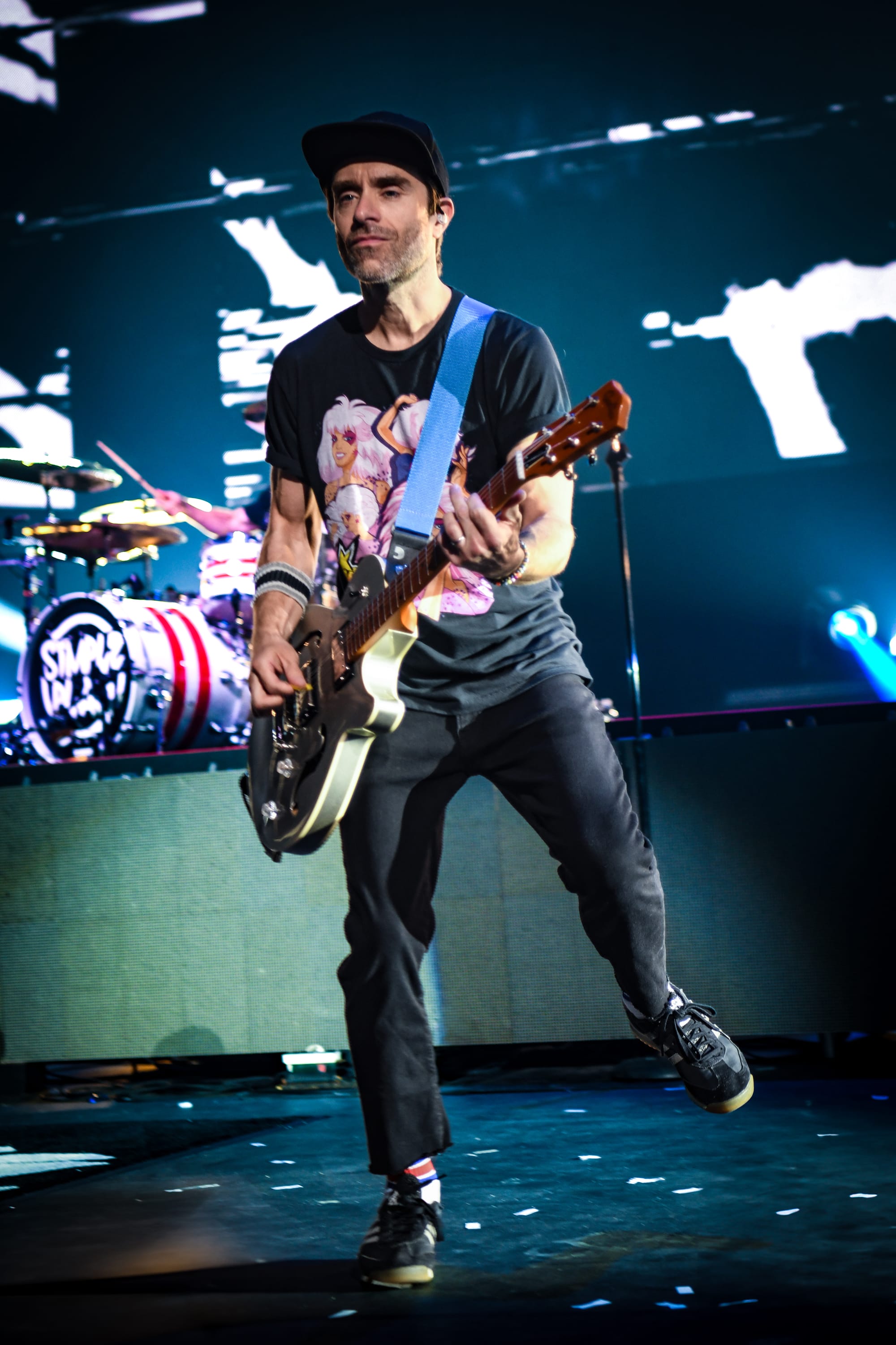 Despite the fact that it was a Thursday night and the crowd had already been going hard for three hours at this point, and that the crowd largely consisted of elder emos, energy was high as the crowd eagerly waited for Simple Plan to take the stage. The lights dimmed, and a video montage began to play, including a mix of video clips of the band when they were just getting their start, along with present-day videos of the band playing to massive crowds, stirring nostalgia as they showcased how far the band has come. Fans went wild as Pierre, Chuck, Jeff, and Sebastien took the stage, kicking off their set with fan favorite “I’d Do Anything,” featuring a couple of impressively high jumps from Simple Plan frontman Pierre Bouvier. The set started off with a bang, with cryo, streamers, and confetti all within the first three songs of the set—production that is usually reserved for the end of a performance. Production also featured a large LED screen at the back of the stage, projecting various videos and visuals along with each song, further enhancing the audience’s experience.