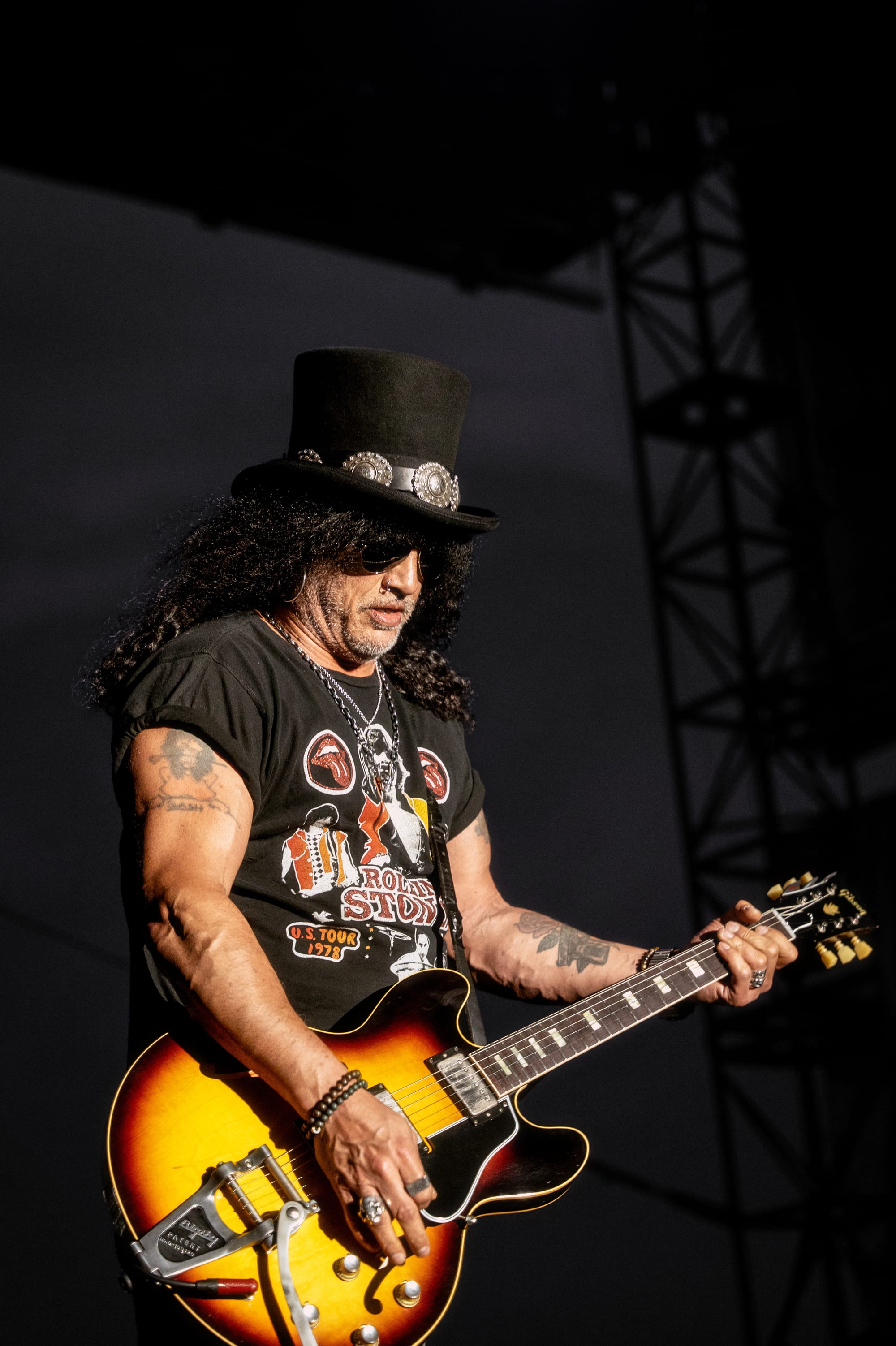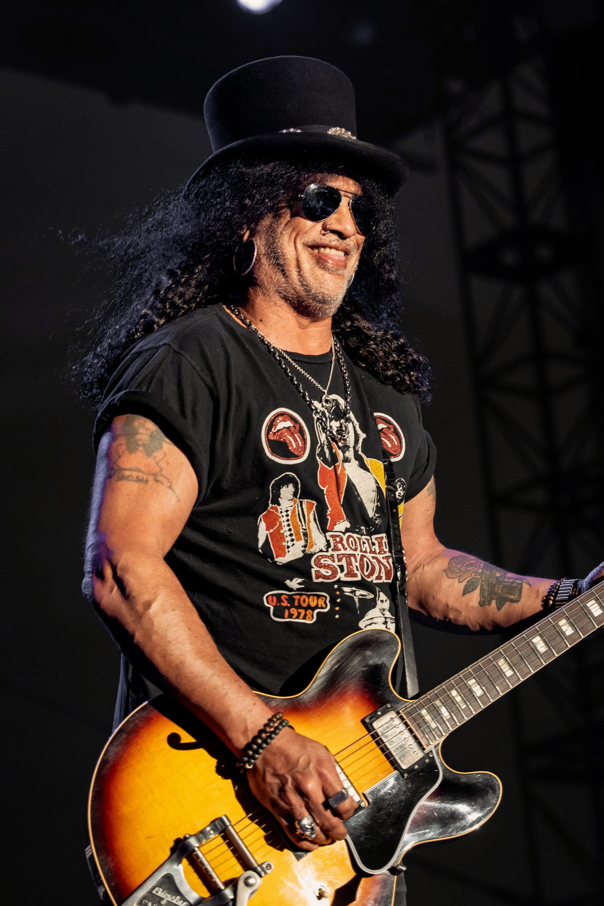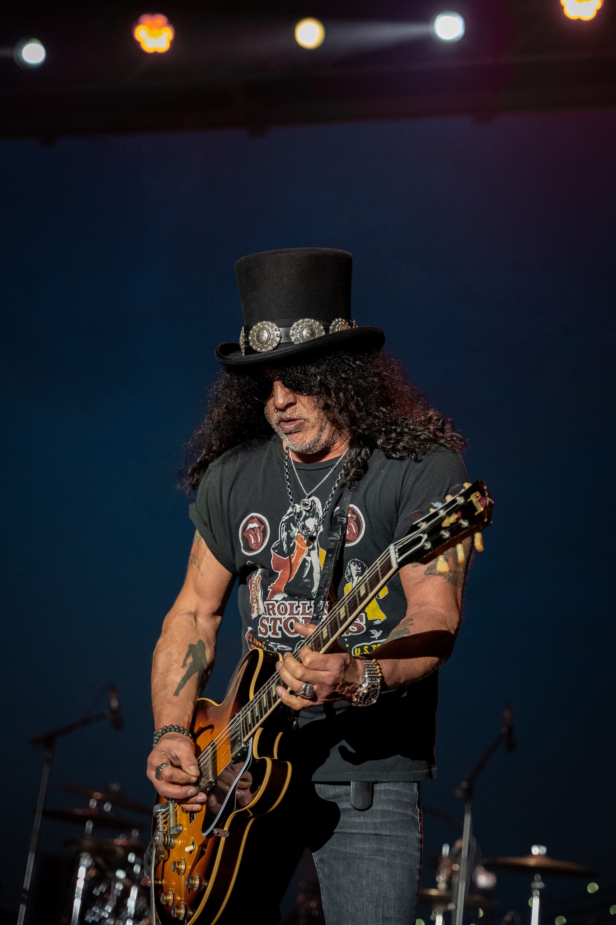 Last, but not least, we had the privilege of witnessing the musical talents of Slash, the distinguished rock star best known as the lead guitarist of Guns N' Roses. As the crowd surged to the front of the stage, the anticipation was electrifying. His bandmates emerged to a loud ovation, and then Slash himself appeared, wearing his iconic top hat and black shades. He had the look of a veteran, taking in the scene but also preparing to deliver a five-star performance.