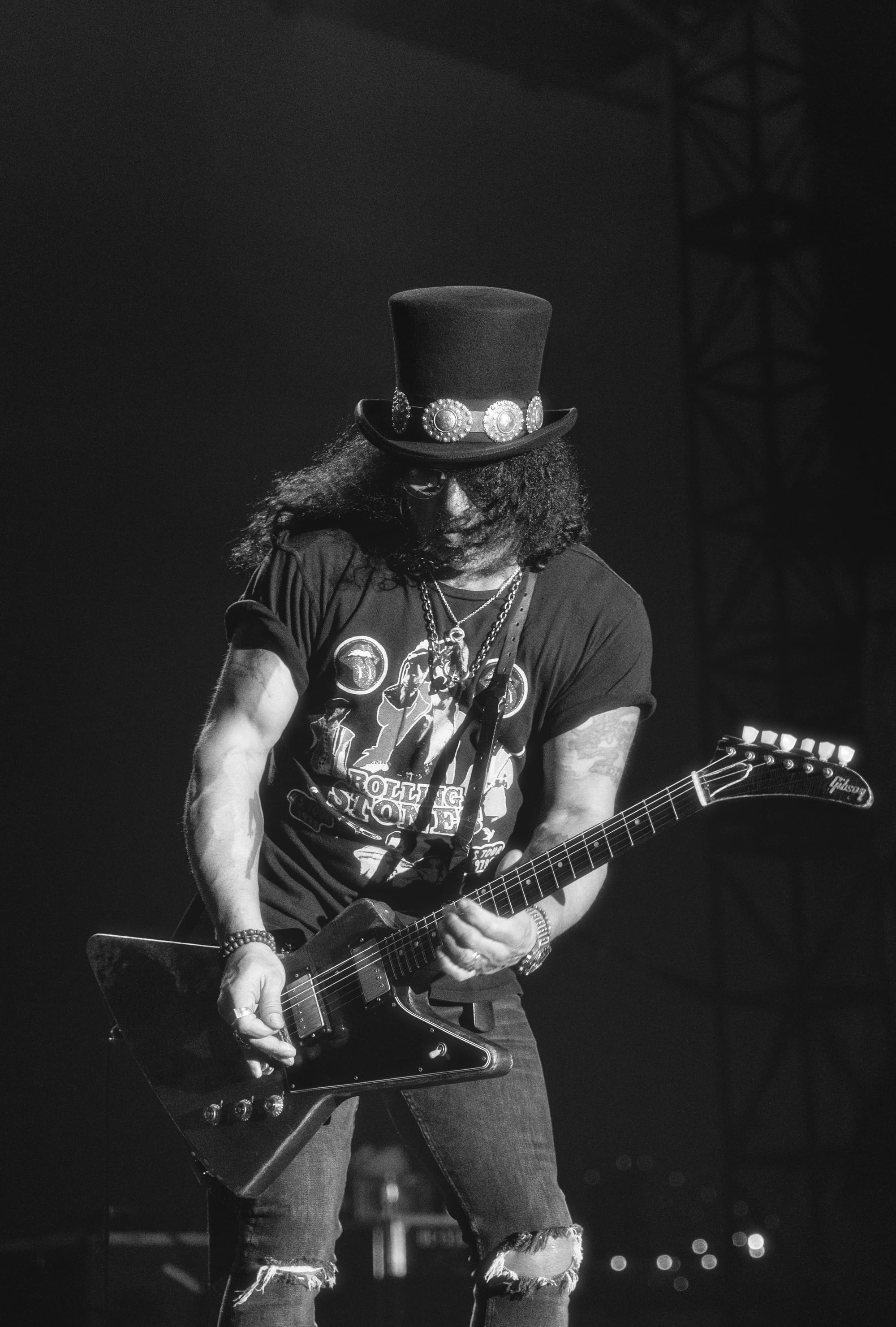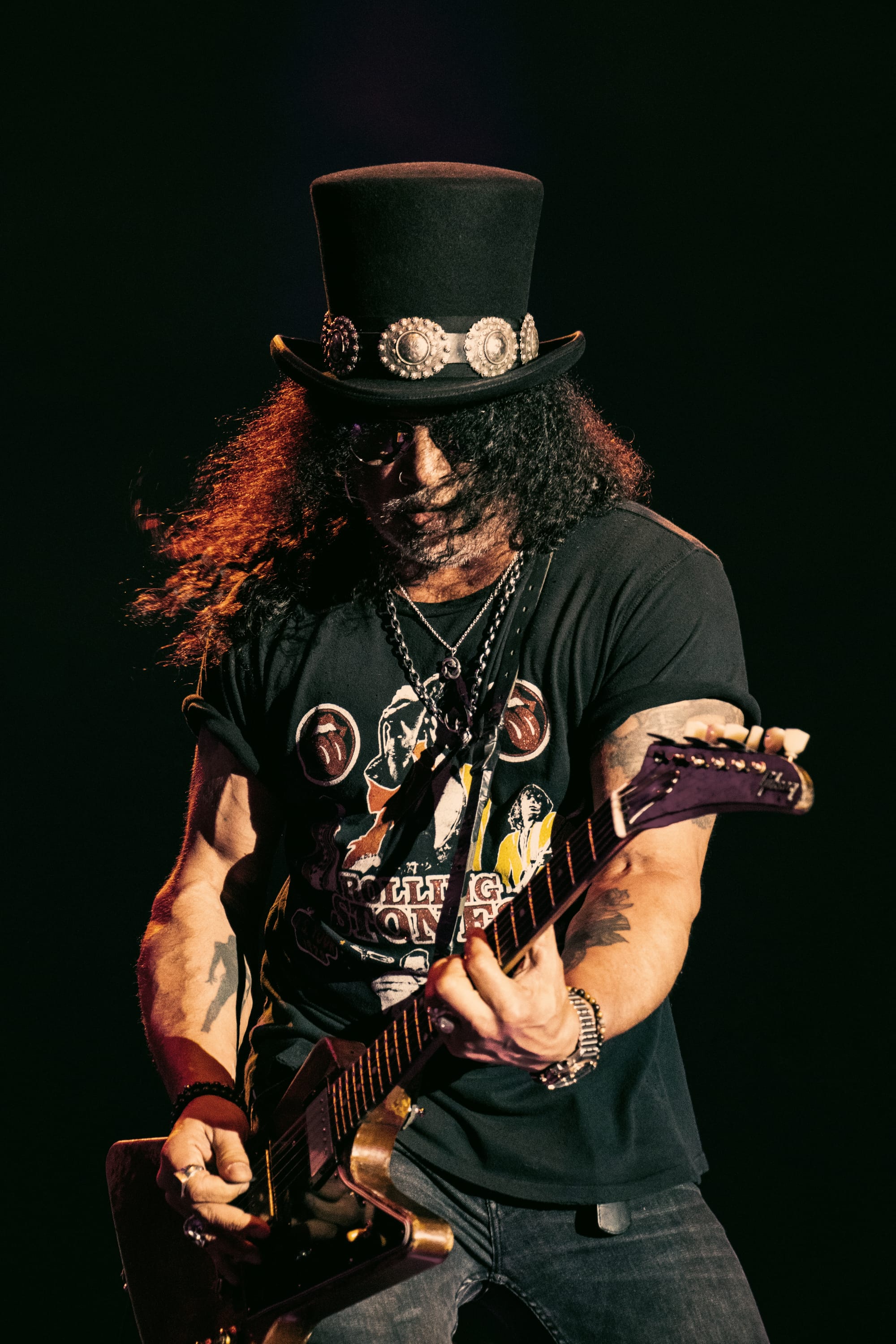 Before the show, I had a conversation with an audience member about how unlikely it was for Slash to cover any Guns N’ Roses songs during his set. The man with a red beard, had been to about ten of Slash's prior shows dating back to the '90s, so he seemed like a real expert on the subject. This conversation left me more curious than usual. What would the setlist be if not Guns N' Roses songs? Would he perform new material? Safe to say, I was just as eager to see the performance as all the fans gathered behind me.He kicked off the show with a funky rock rendition of “Parchman Farm Blues,” followed by well-received covers of popular artists like Fleetwood Mac, Howlin’ Wolf, and Freddie King. The most interesting part of the beginning of the set was his noticeable blending into the background. He had a rockstar aura without overshadowing everyone around him. He let his bandmates—Tash Neal, Teddy “Zig Zag” Andreadis, and Johnny Griparic—do most of the heavy lifting while expertly carving out seamless guitar riffs and inventive solos when the opportunity presented itself. His guitar work was the major focal point of the evening. With the help of his bandmates, he showed why blues will forever be relevant to music, cycling through sounds that brought everyone back to a much simpler time.