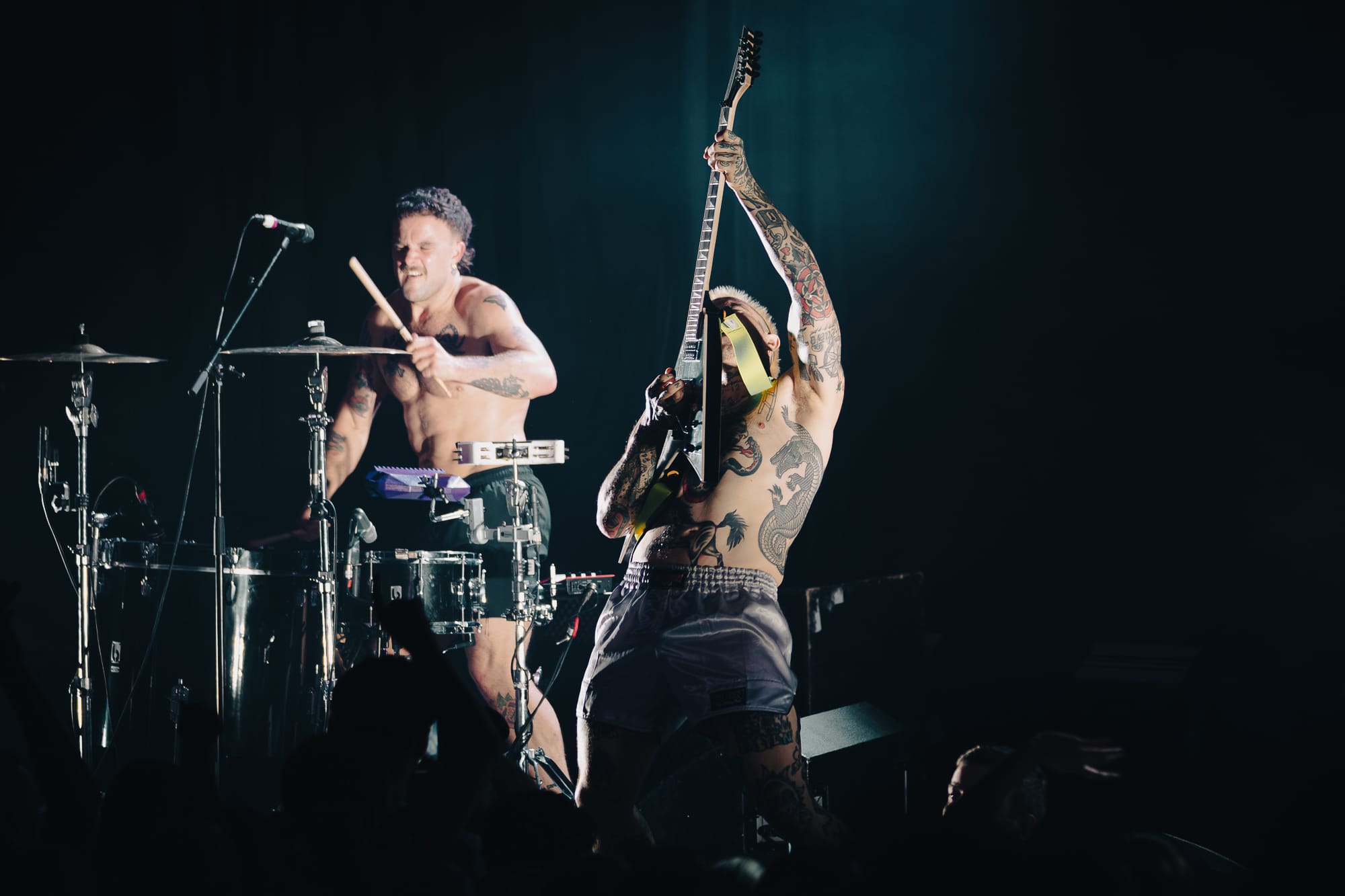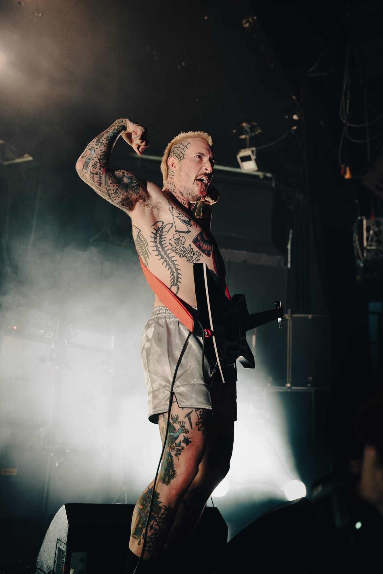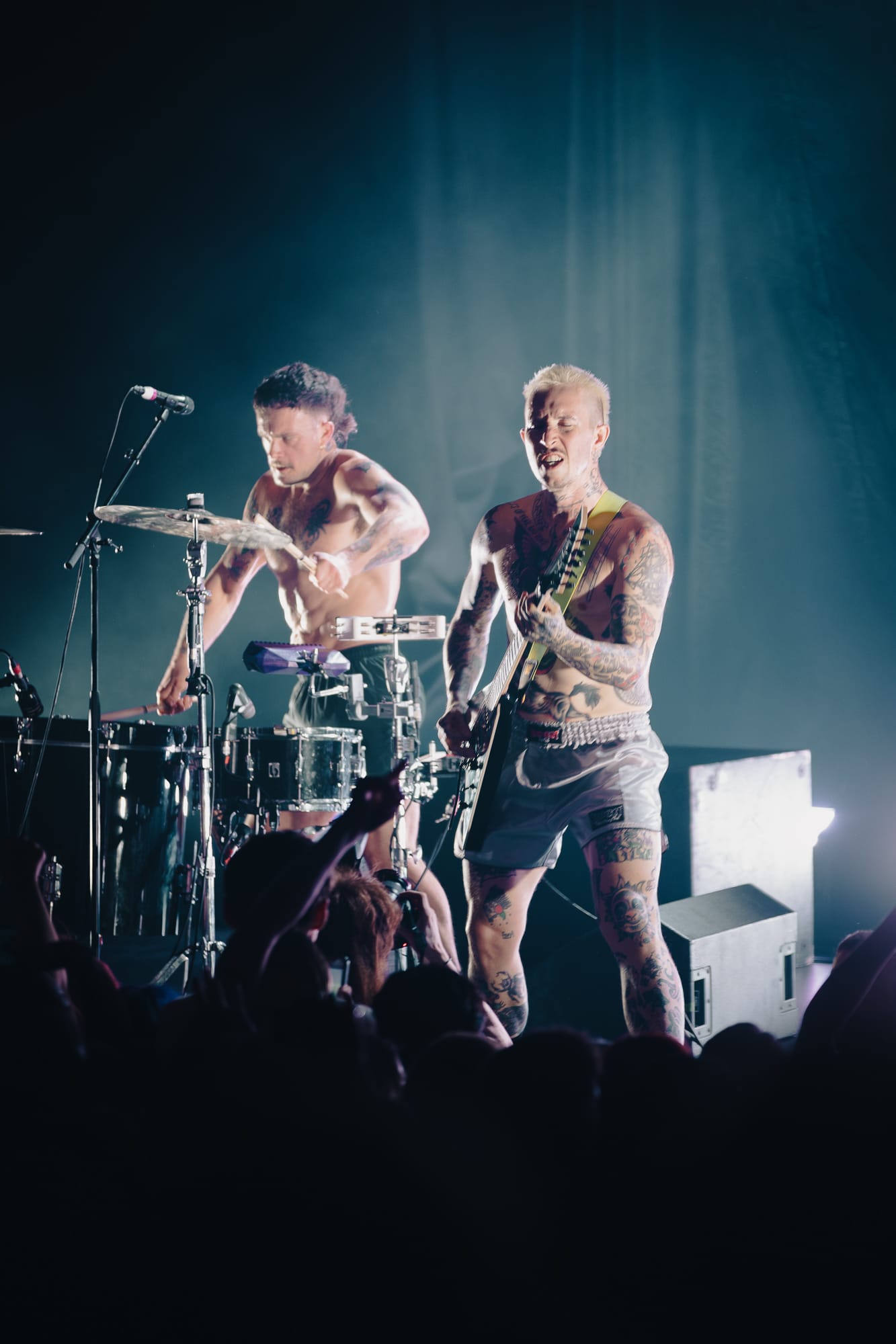 As is customary, shirts were never on to begin with, so as we moved into the next Heavy Jelly track, "Mirror Muscles," the boys were already primed for the necessary flexing to follow. "Isaac Is Typing", "Bin Juice Disaster," and "Act Violently" swiftly followed. The latter acted as a queue for the already frenzied crowd to take it up a gear and match the energy of Isaac and Laurie on stage.