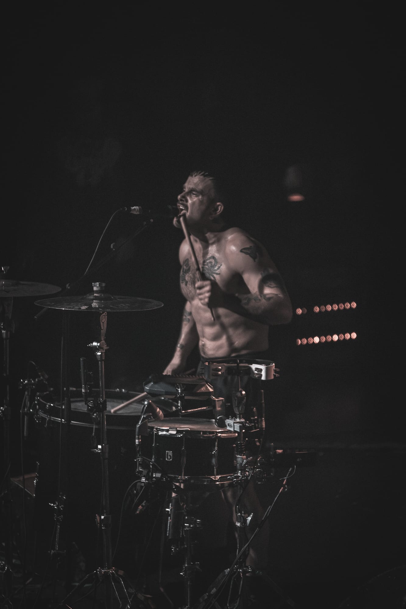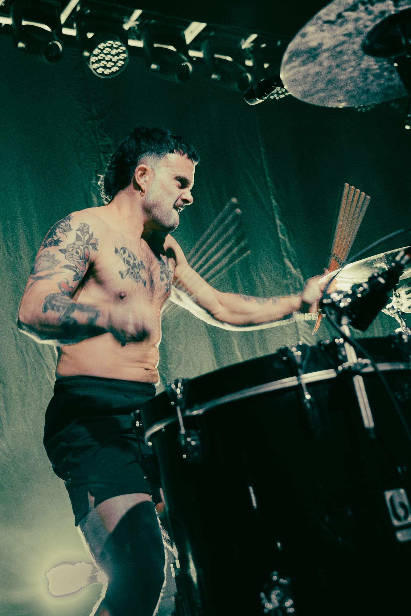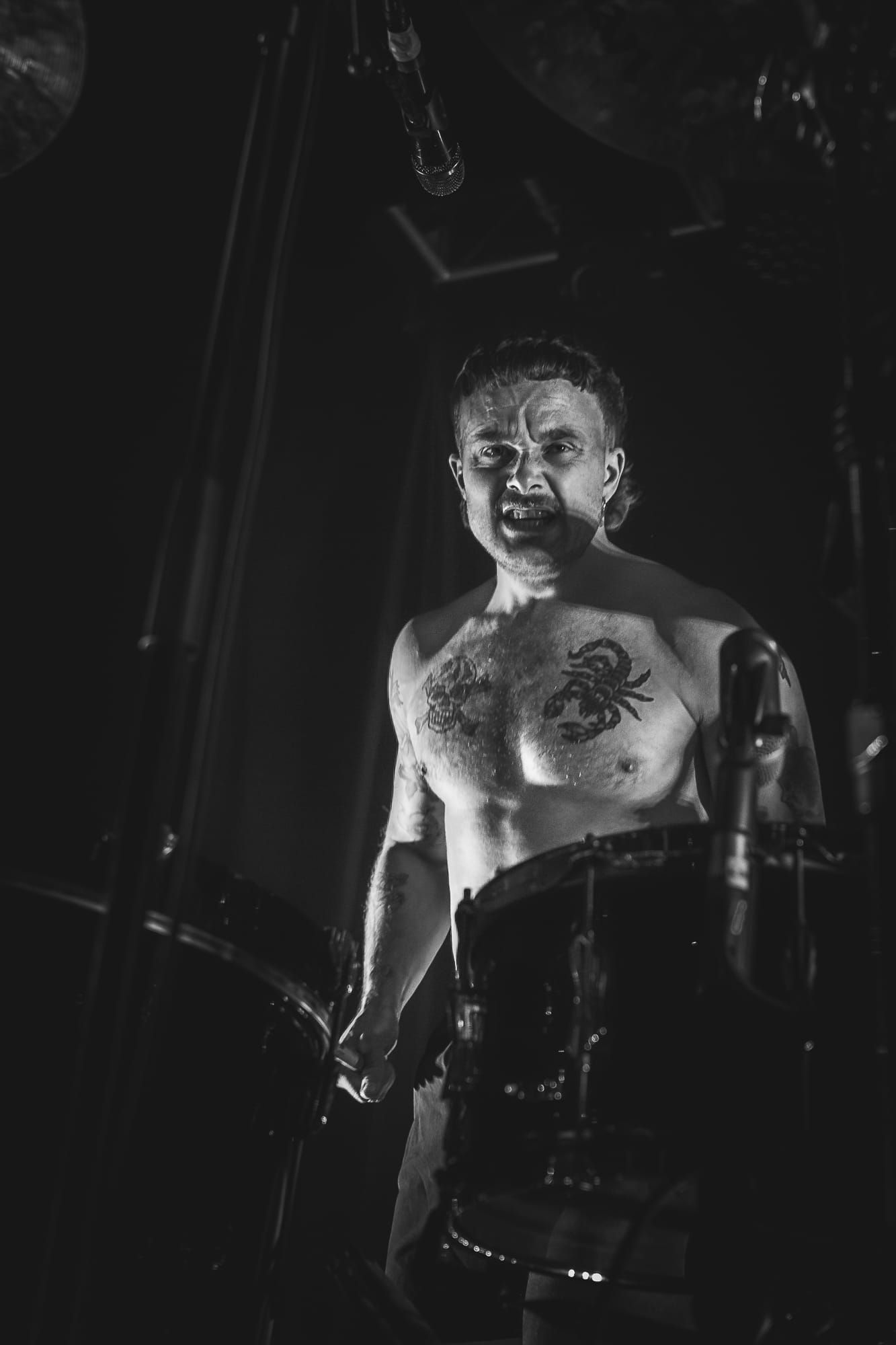 As is customary, shirts were never on to begin with, so as we moved into the next Heavy Jelly track, "Mirror Muscles," the boys were already primed for the necessary flexing to follow. "Isaac Is Typing", "Bin Juice Disaster," and "Act Violently" swiftly followed. The latter acted as a queue for the already frenzied crowd to take it up a gear and match the energy of Isaac and Laurie on stage.