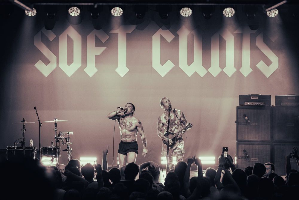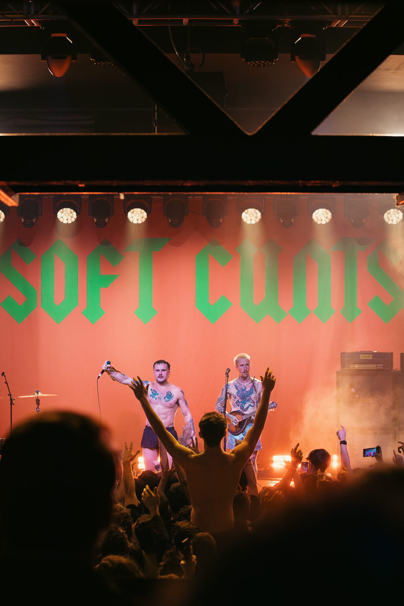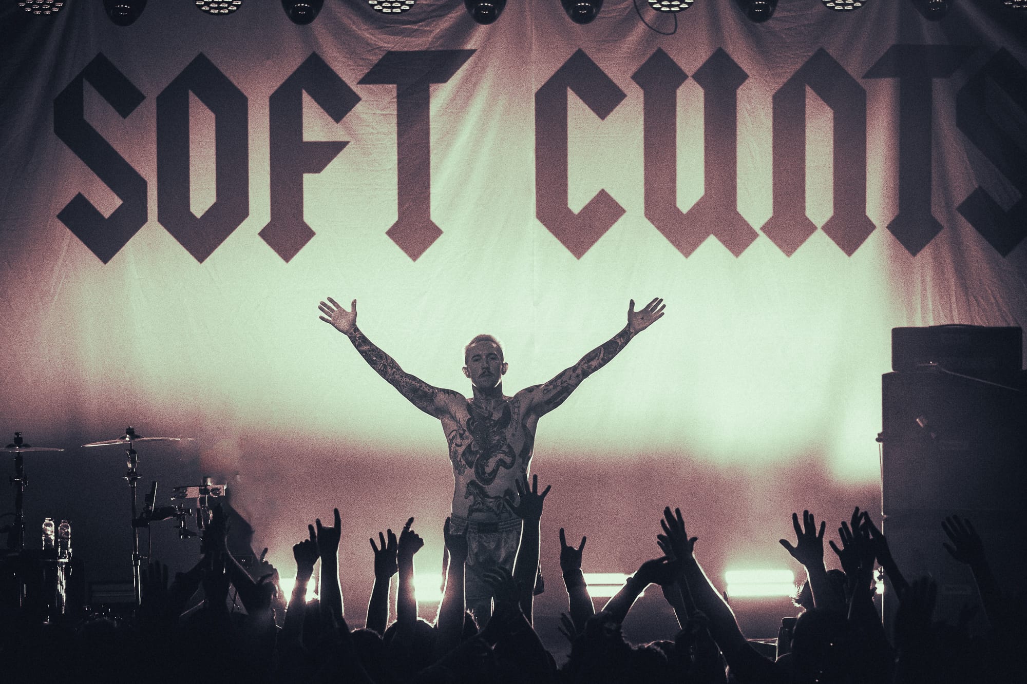 The assembled masses were back in full voice for Are You Satisfied?'s "Sockets." The crowd favorite "Punk's Dead" came next and saw the audience quite literally losing their shit. "Is this another publicity stunt; Thought you were rowdy; Thought you were punks; What the fuck's with the new name anyway; Soft Play more like soft cunts"; on queue to which the plain black curtain behind the band dropped and revealed, to mass cheers, the huge 'Soft Cunts' banner behind.