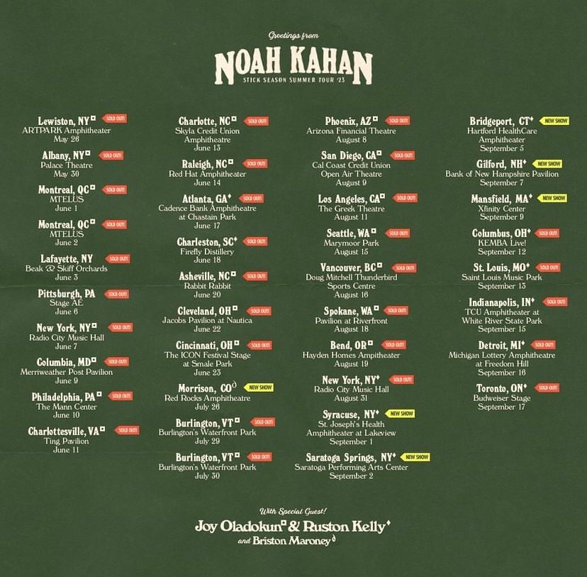 Finally, after much anticipation, Noah announced this junior studio album, Stick Season, on September 14th, 2022. The album was written during the pandemic and was where he began to lean into the folk genre, paying homage to what he grew up listening to. The immediate, overwhelming success of this album allowed Kahan to sell out three legs of his headlining tour.