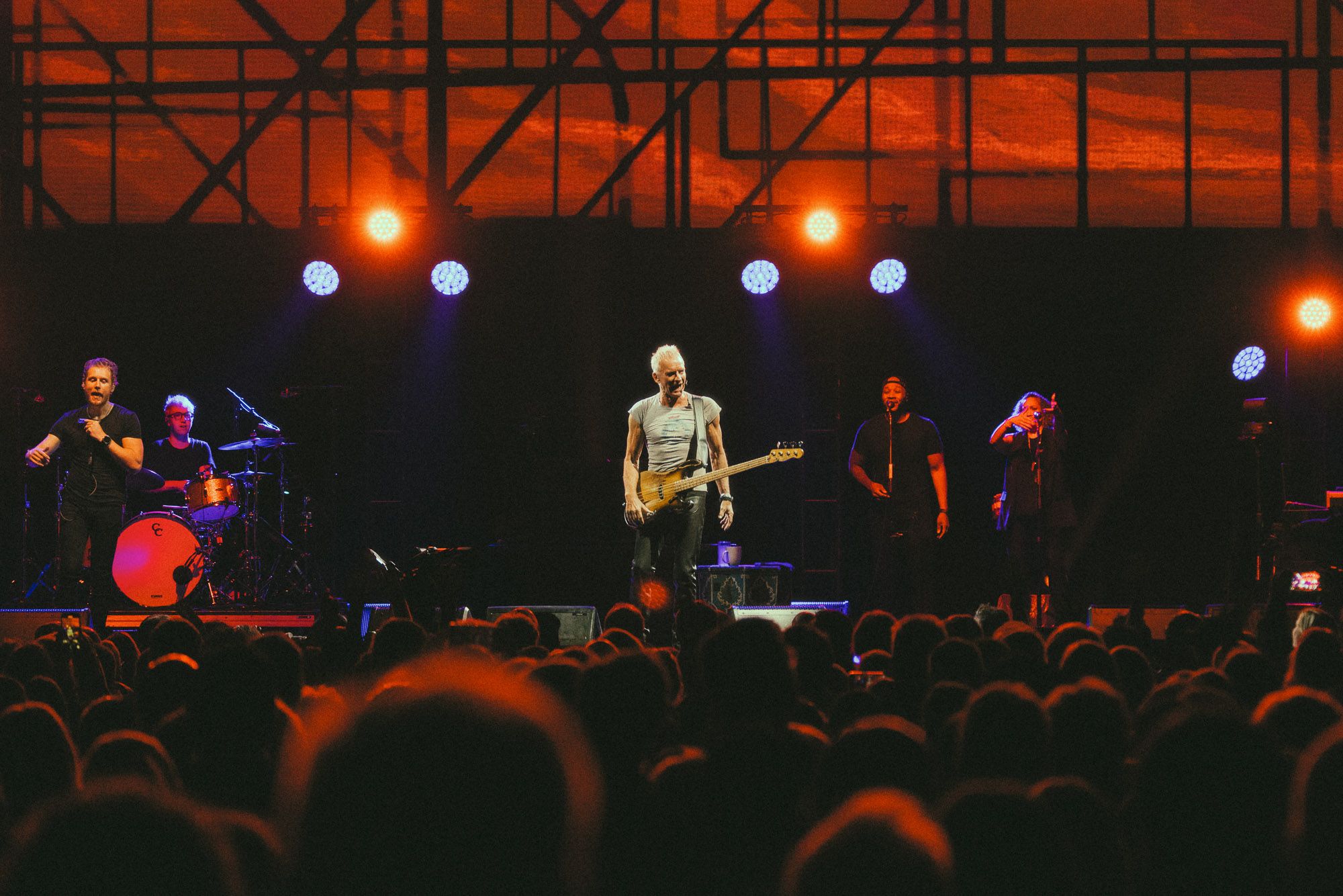 Sting opened the night with the infamous The Police song, “Message in a Bottle,” and it was the best way to kick off the crowd after everyone waited with much anticipation. Fans stood up with their hands in the air and beautiful hues of blue and red filled the stage with spotlights all on him. As he took the stage with his bass guitar pacing back and forth to hype the crowd on both sides, his vocals continue to be so powerful and seem so effortless and the sheer talent to hear him live is an experience in itself. Sting’s songs also feature the harmonica, and joining him on the tour was Shane Sager – a musician who has been professionally playing the harmonica for the past 15 years.