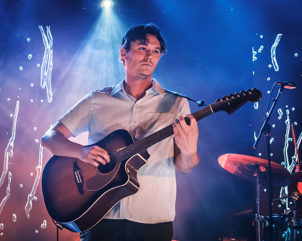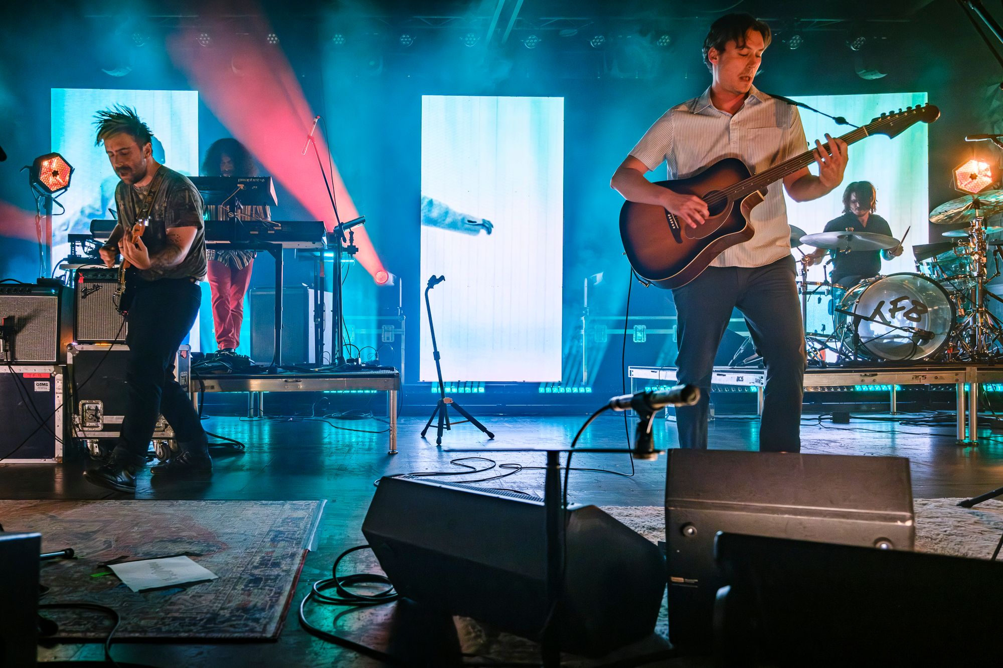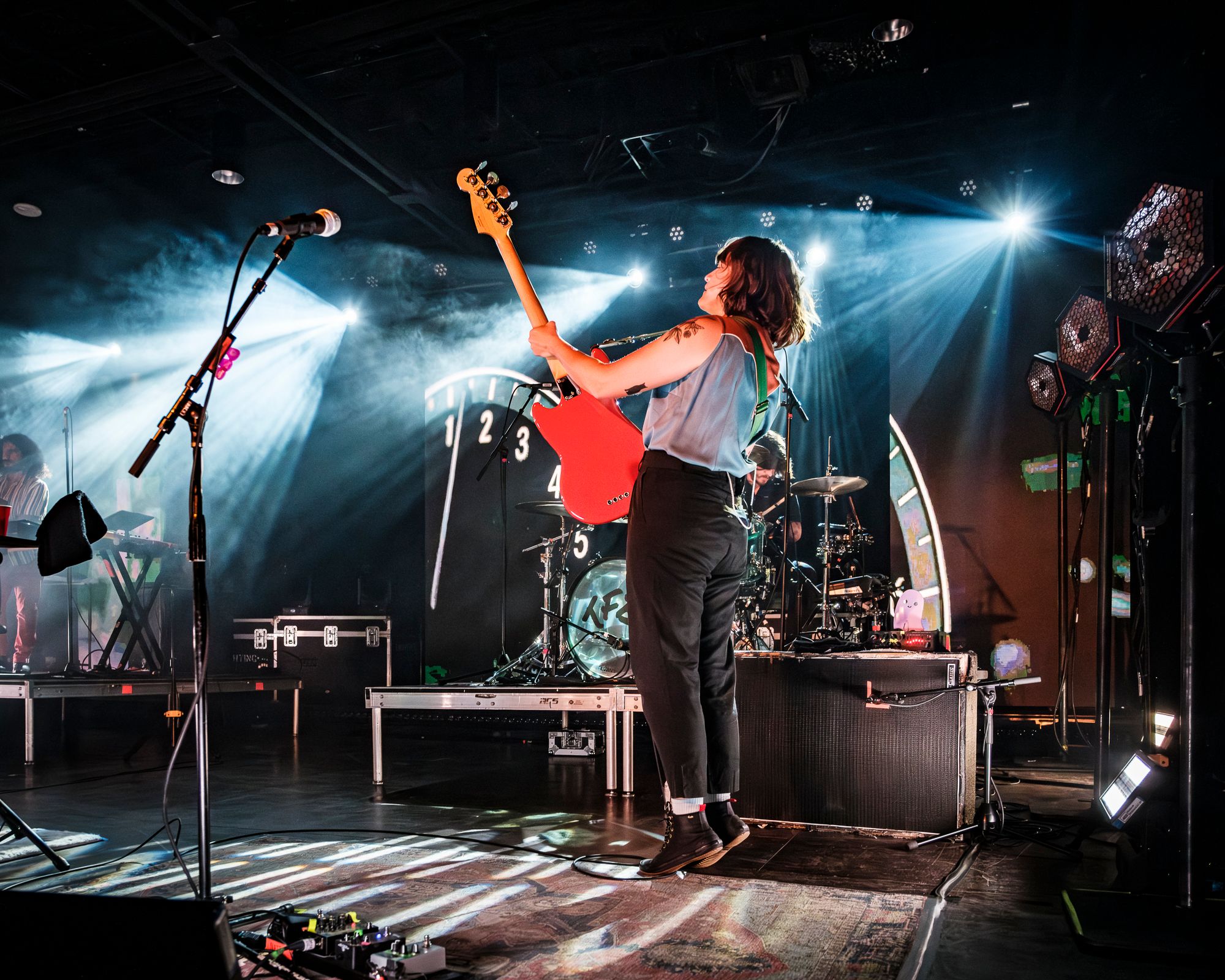 After a brief intermission of guitar techs buzzing around taping down rugs and tuning instruments, the band that had a line stretched over half a city block finally took the stage. Admittedly, I was only vaguely familiar with The Front Bottoms coming into this show, but the screams that erupted from behind me as the band walked out were a sure sign that they had a fierce and loyal following. Three large video walls backed the stage with risers for Roshane Karunaratne’s keyboards on my left and founding member Mathew Uychich’s drum kit to my right. Three evenly placed microphone stands were placed across the front of the stage with bass player Natalie Newbold to the right of lead singer and guitar player Brian Sella and AJ Peacox with his guitar to the left of Brian. This stage setup really served to add some depth while ensuring that each member of the band was highlighted. The production was impressive for a show in a mid-sized venue, but what really stood out was the amazing amount of energy and stage presence The Front Bottoms brought. I don’t think that the band stopped bouncing all night! I cannot remember the last time I saw a band who genuinely seemed to be having this much fun performing.