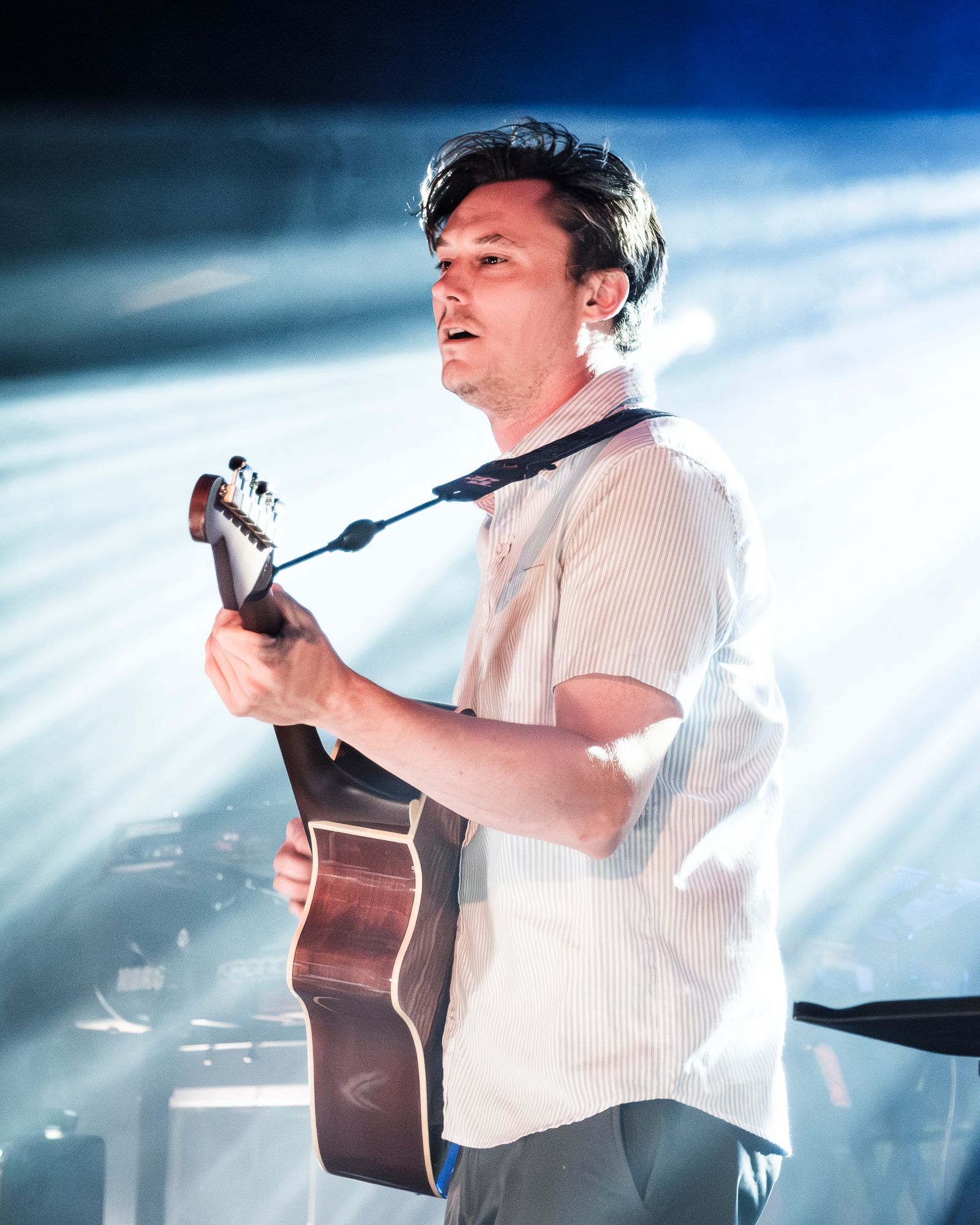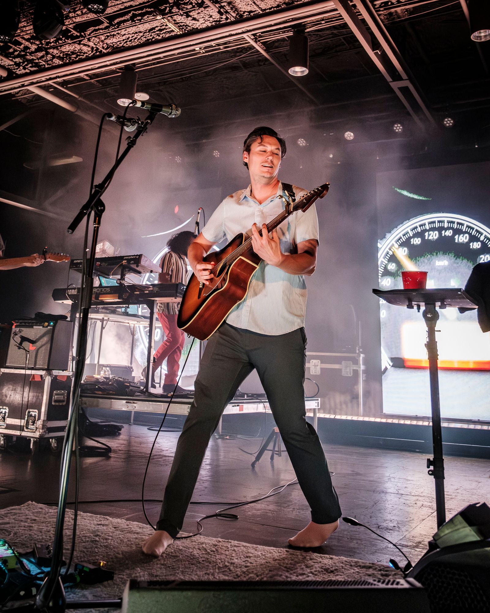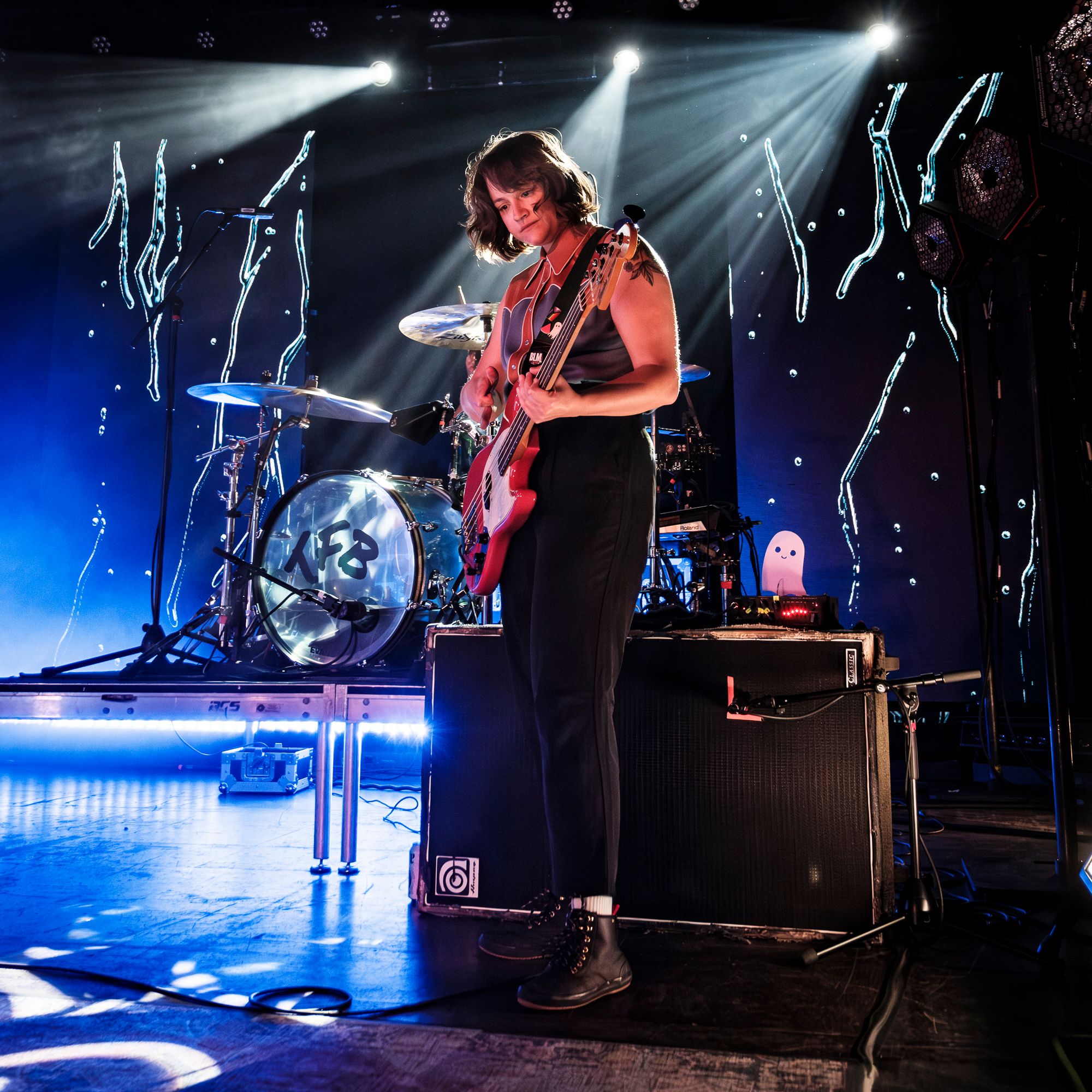 After a brief intermission of guitar techs buzzing around taping down rugs and tuning instruments, the band that had a line stretched over half a city block finally took the stage. Admittedly, I was only vaguely familiar with The Front Bottoms coming into this show, but the screams that erupted from behind me as the band walked out were a sure sign that they had a fierce and loyal following. Three large video walls backed the stage with risers for Roshane Karunaratne’s keyboards on my left and founding member Mathew Uychich’s drum kit to my right. Three evenly placed microphone stands were placed across the front of the stage with bass player Natalie Newbold to the right of lead singer and guitar player Brian Sella and AJ Peacox with his guitar to the left of Brian. This stage setup really served to add some depth while ensuring that each member of the band was highlighted. The production was impressive for a show in a mid-sized venue, but what really stood out was the amazing amount of energy and stage presence The Front Bottoms brought. I don’t think that the band stopped bouncing all night! I cannot remember the last time I saw a band who genuinely seemed to be having this much fun performing.
