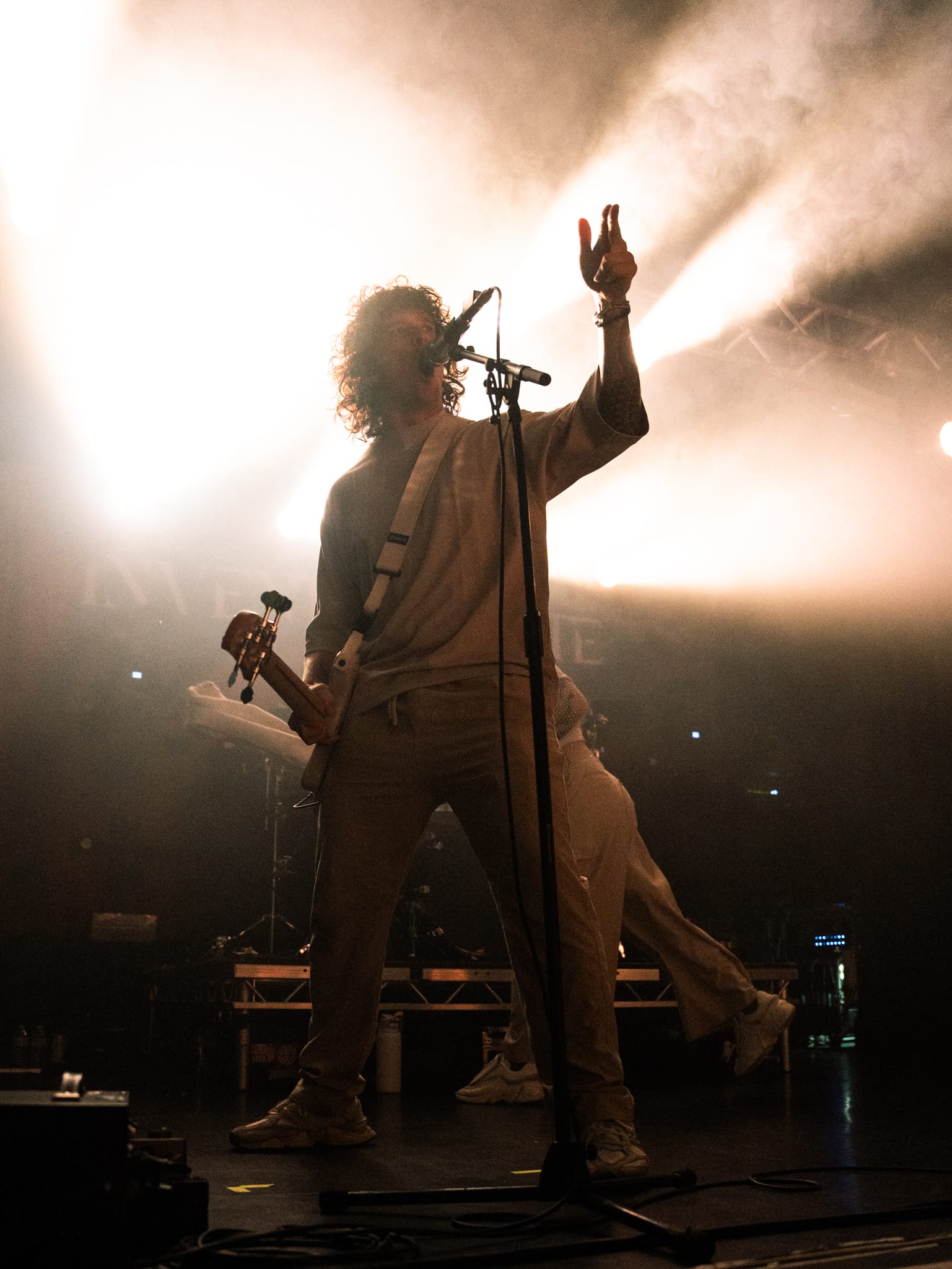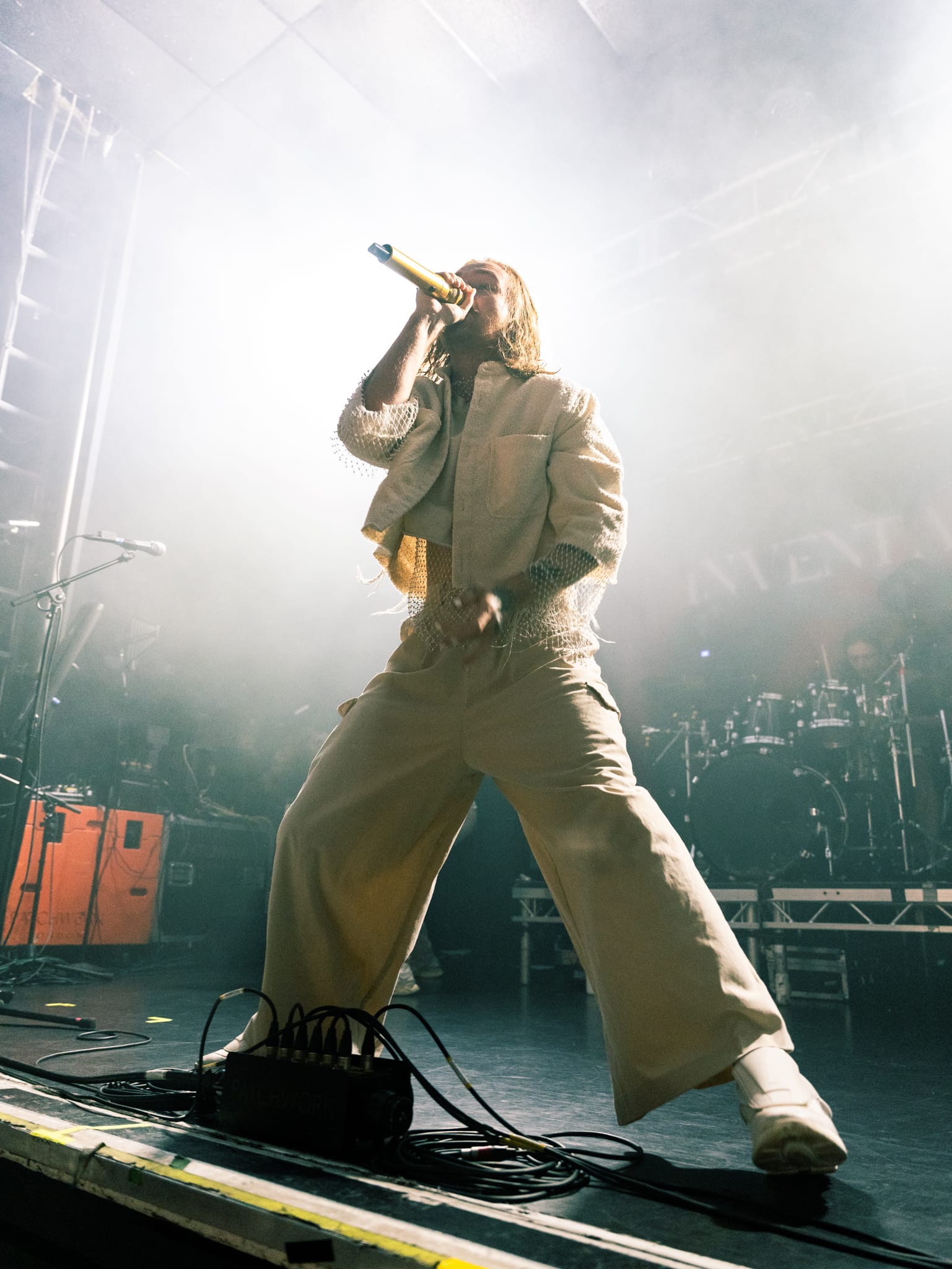Following Acres was the metalcore group Invent Animate, all the way from Texas. Many in the crowd were sporting Invent Animate shirts, making it clear that the band was a major draw for the night as well. Dressed in bright white outfits adorned with small diamante crystals on the sleeves, the band gave off an almost whimsical, ethereal vibe—at least until the first note hit. As soon as the crashing drums and roaring guitars kicked in, the atmosphere shifted dramatically. The two guitarists flanked the lead singer, kicking and spinning to the beat, channelling the band’s signature blend of aggression and melody, and this is when the crowd surfers started pouring into the photo pit. The set maintained a fast pace, broken up by softer, more emotive moments that showcased lead singer Marcus Vik’s vocal range.