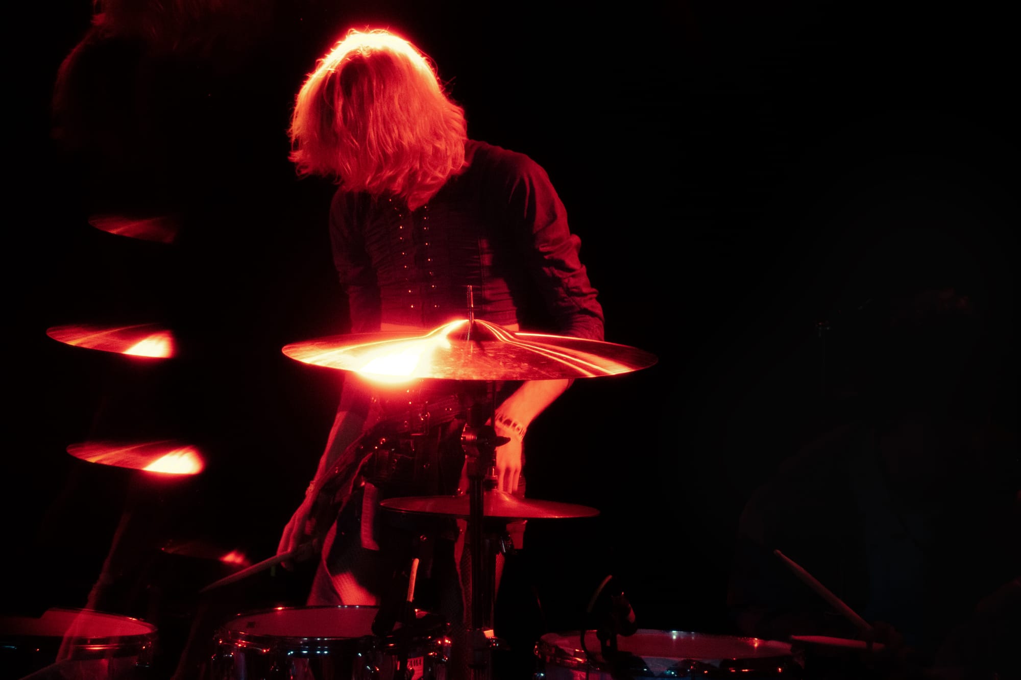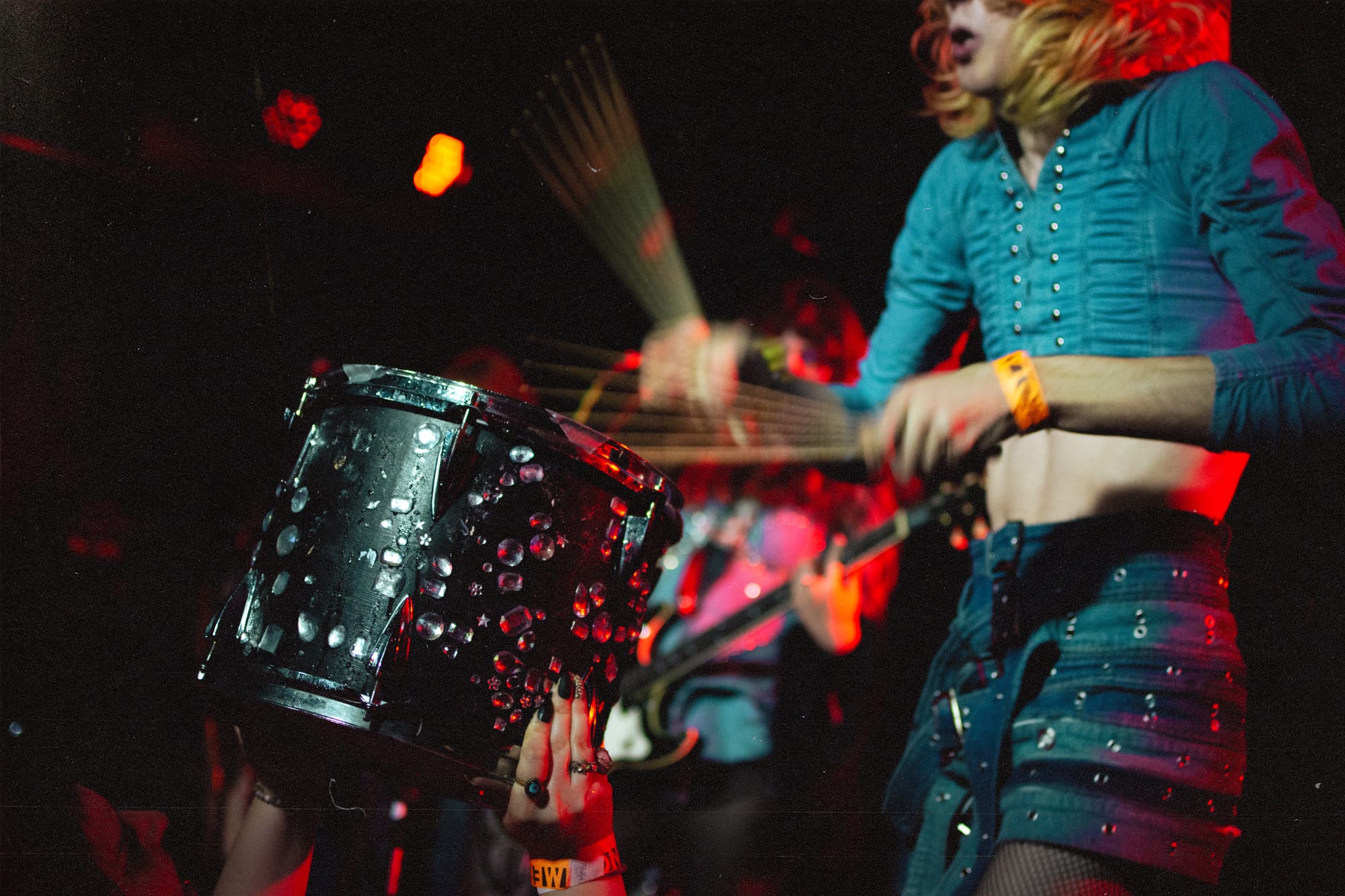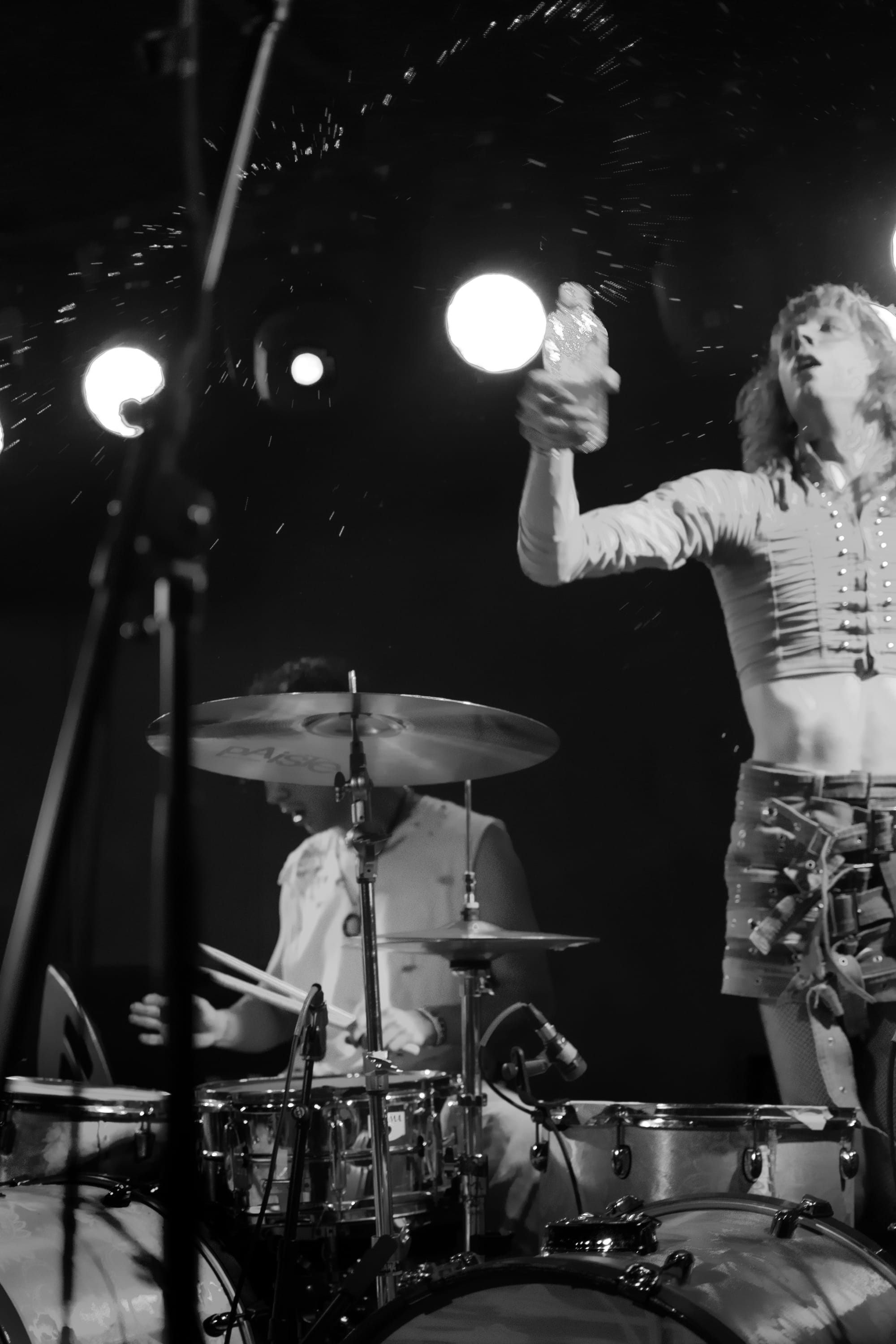 Baby Pottersmith playing the drums and spraying water out into the audience