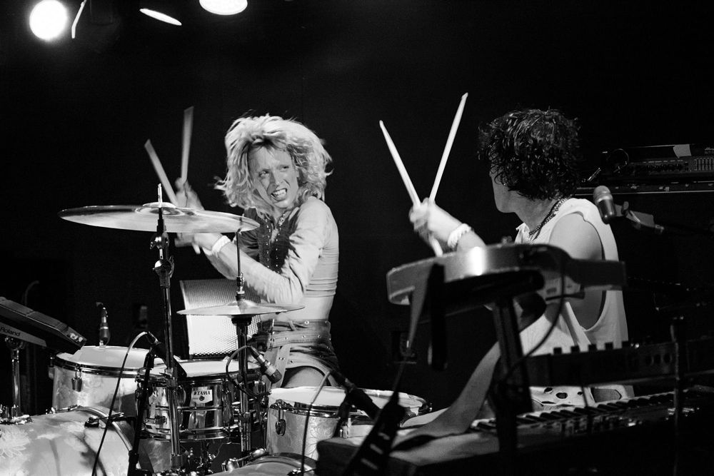 Baby Pottersmith playing the drums and spraying water out into the audience