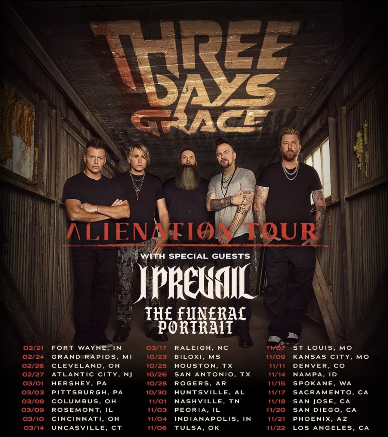 Early in November, Three Days Grace announced they are going on tour to finish promoting their "Alienation" album, which came out on August 22, 2025. On this tour, they are bringing along two special guests, I Prevail and The Funeral Portrait. The tour kicks off in Fort Wayne, IN, on February 21.