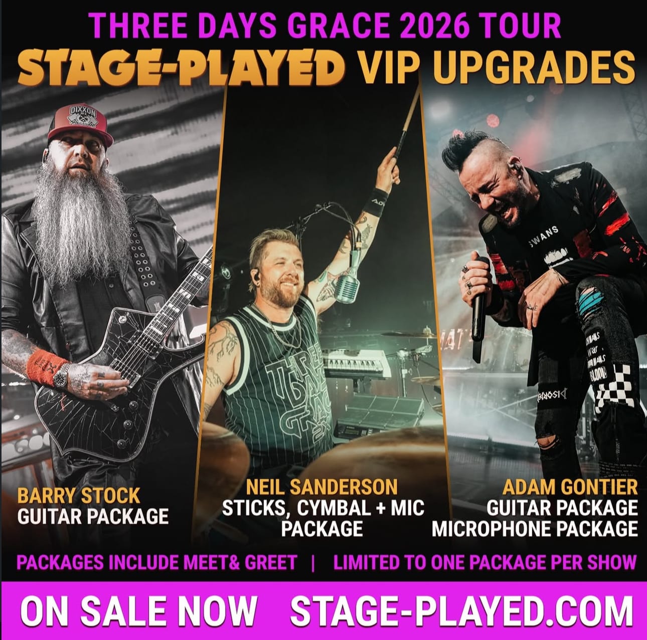 Stage-Played is an experience fans can explore with one of the members of Three Days Grace: Neil Sanderson, Adam Gontier, or Barry Stock. It is a once-in-a-lifetime experience, run by Jeramy Donias & MykillinK and powered by WBgear. More information about this experience can be found here.