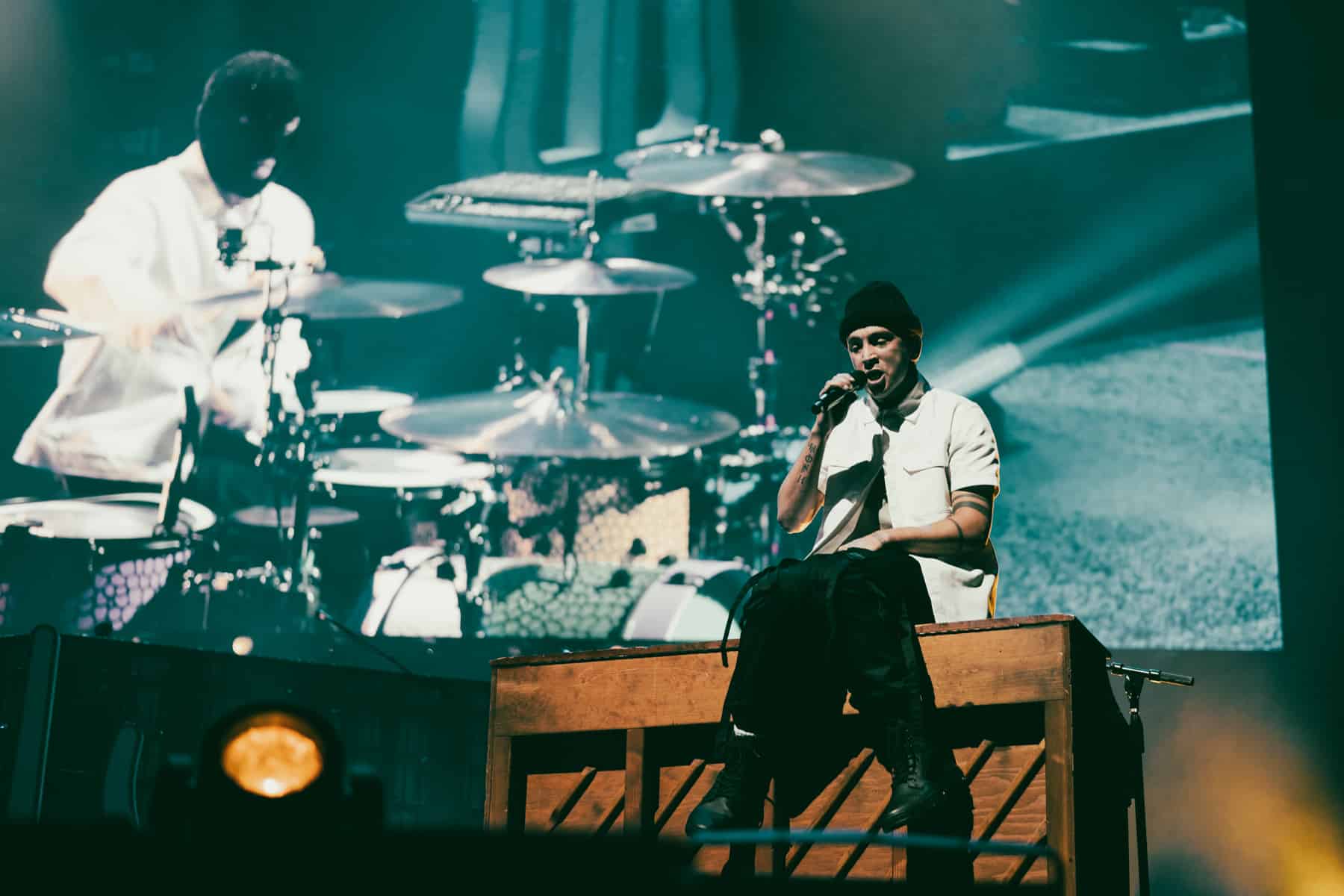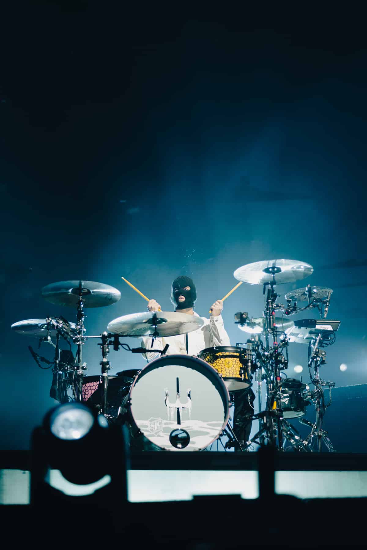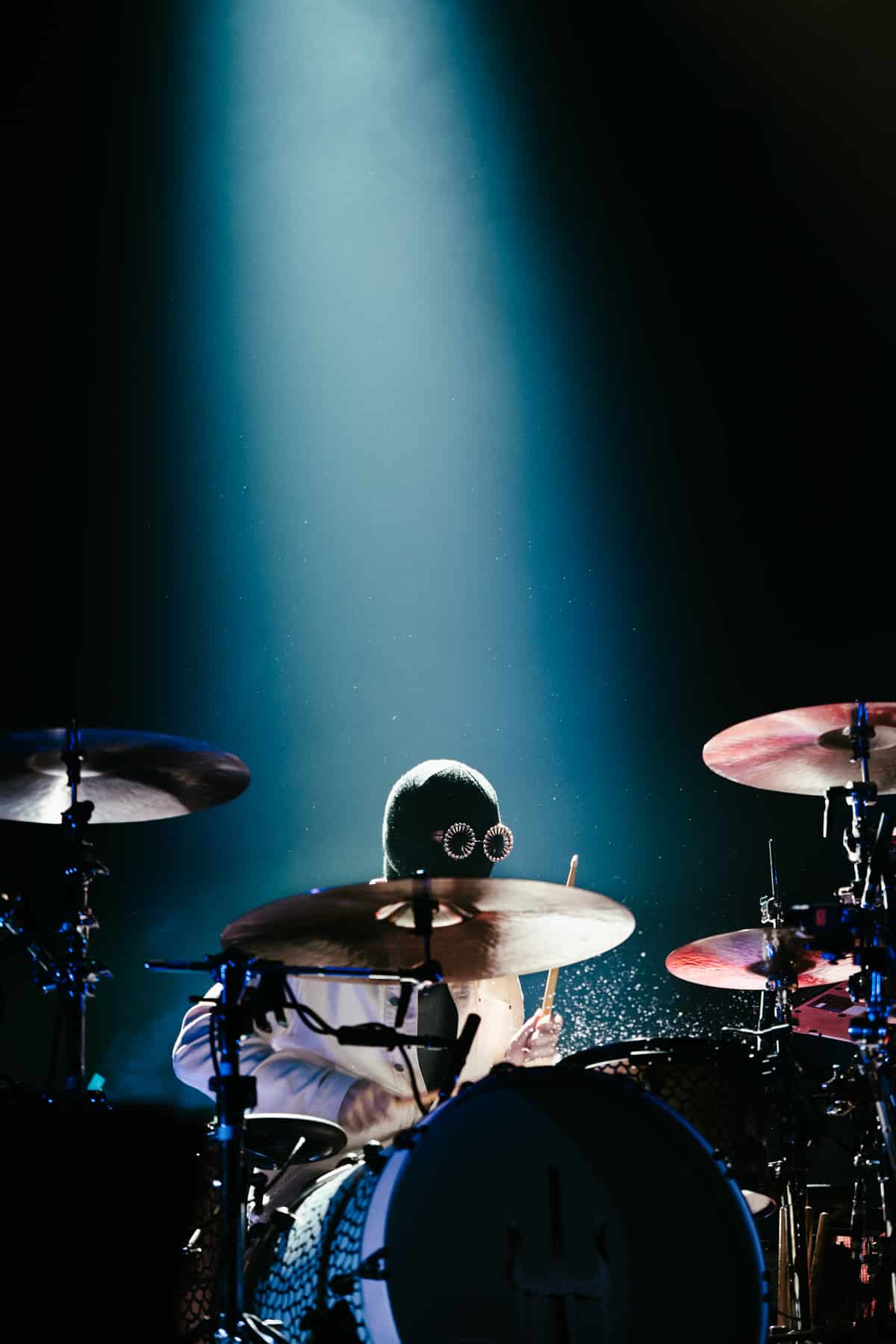 Emerging from a door in the floor of the stage, the duo was surrounded by fake snow, dawning black face masks and goggles. Fans went crazy as Josh Dunn headed over to his drum set, and Tyler Joseph took to the mic. With fog sealing from his goggles, the opening song “Good Day” began.