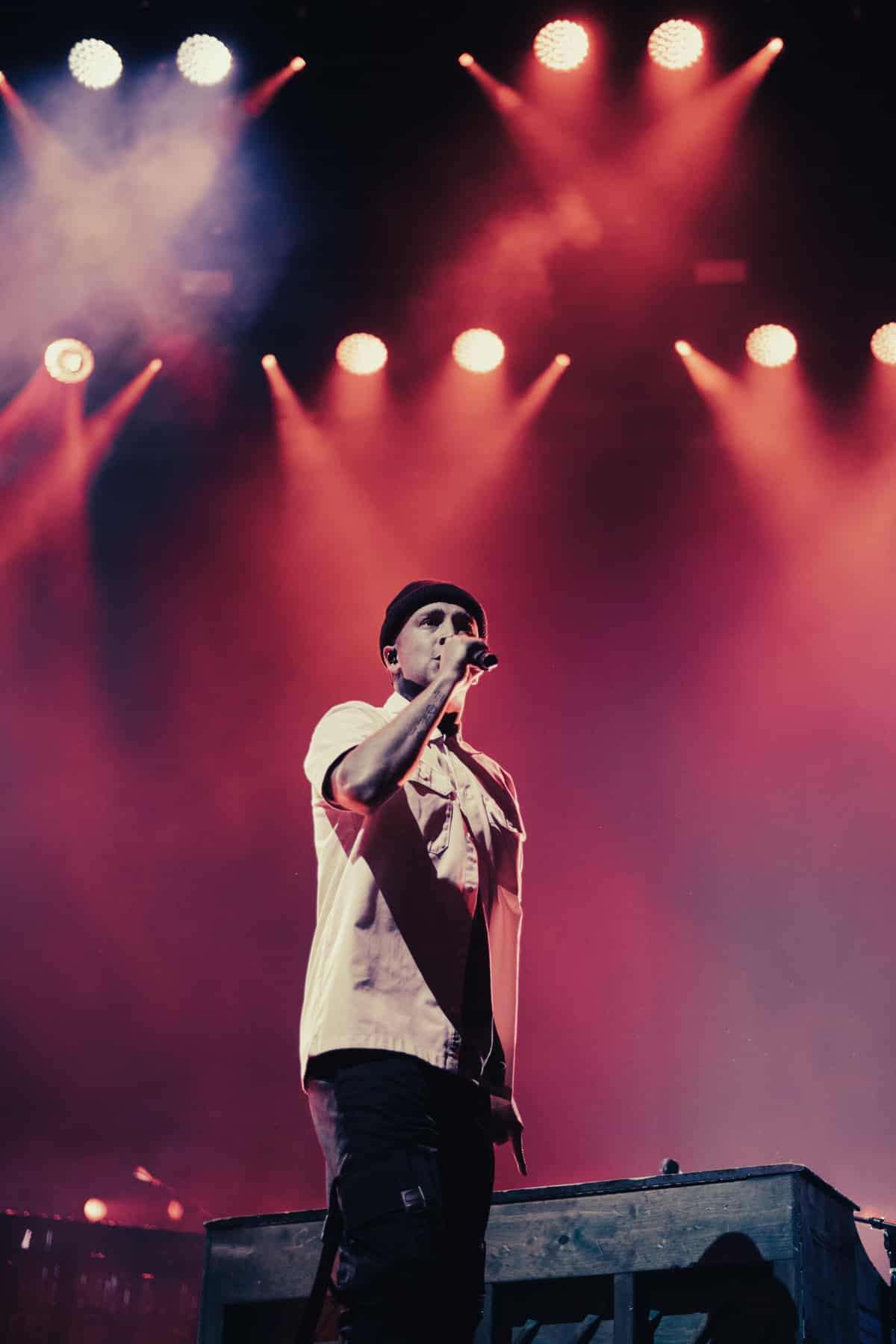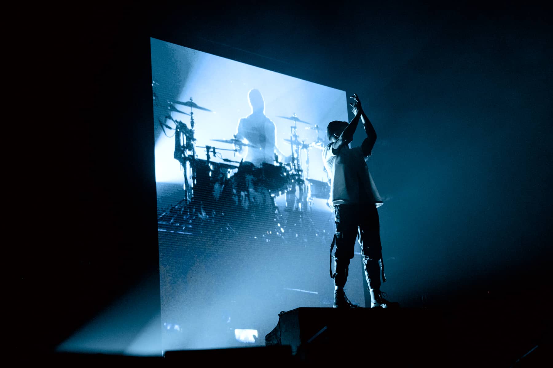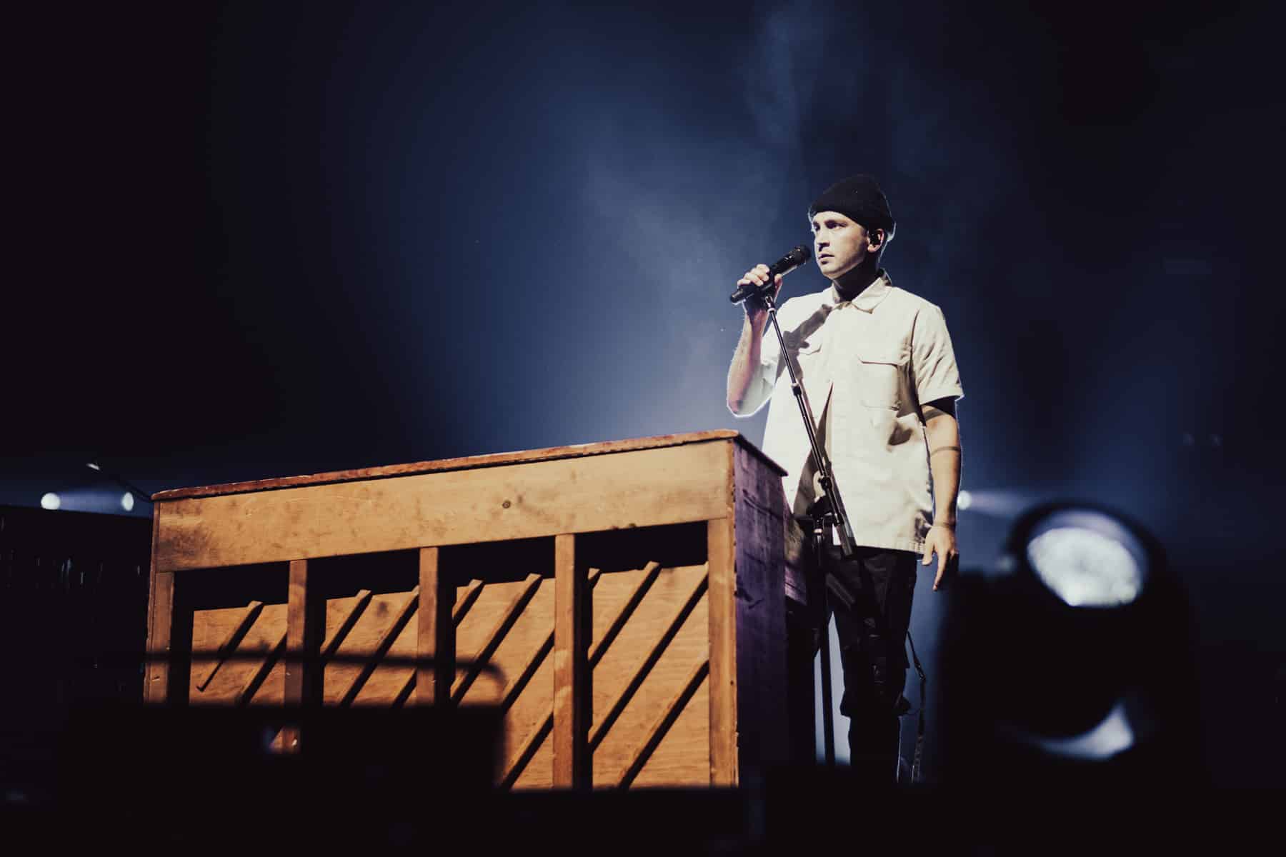 Emerging from a door in the floor of the stage, the duo was surrounded by fake snow, dawning black face masks and goggles. Fans went crazy as Josh Dunn headed over to his drum set, and Tyler Joseph took to the mic. With fog sealing from his goggles, the opening song “Good Day” began.