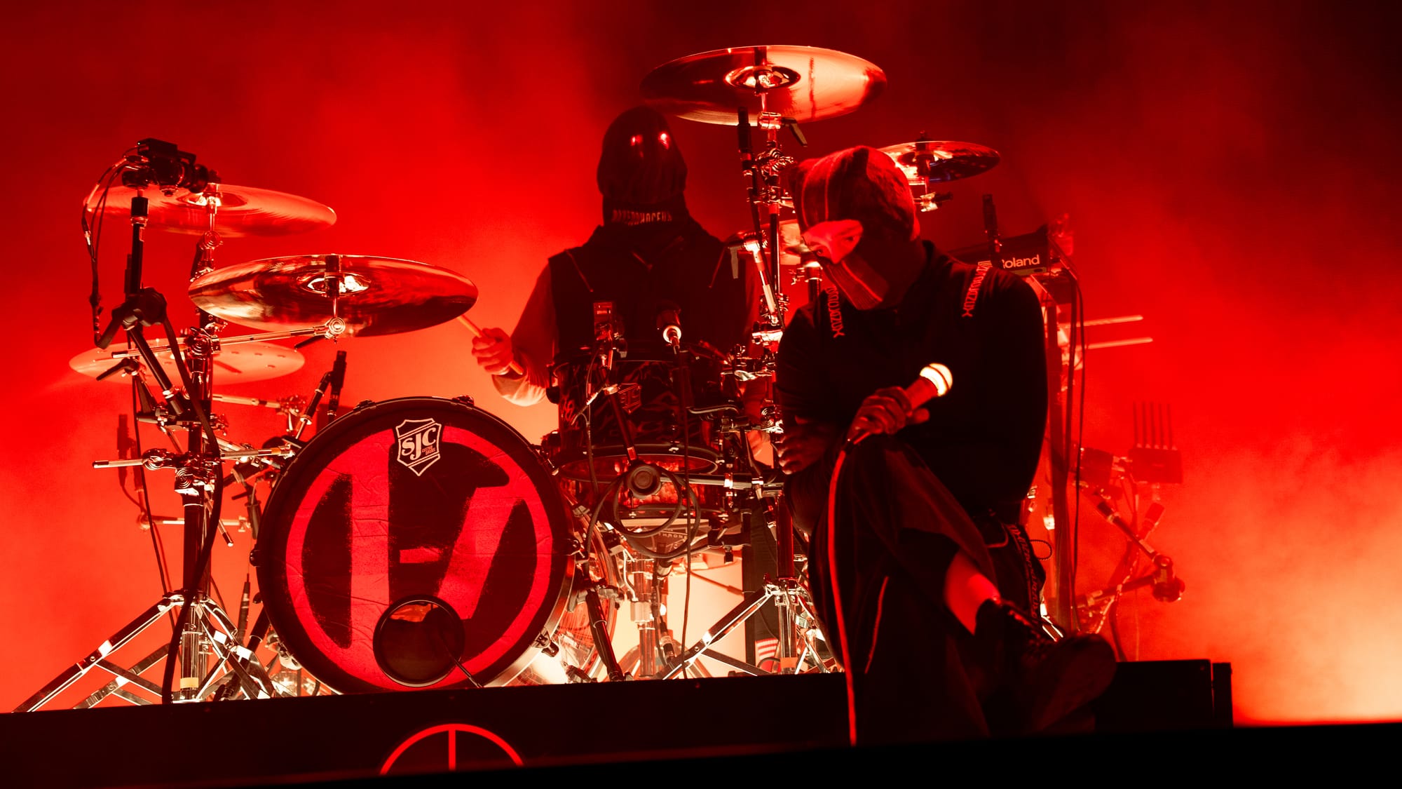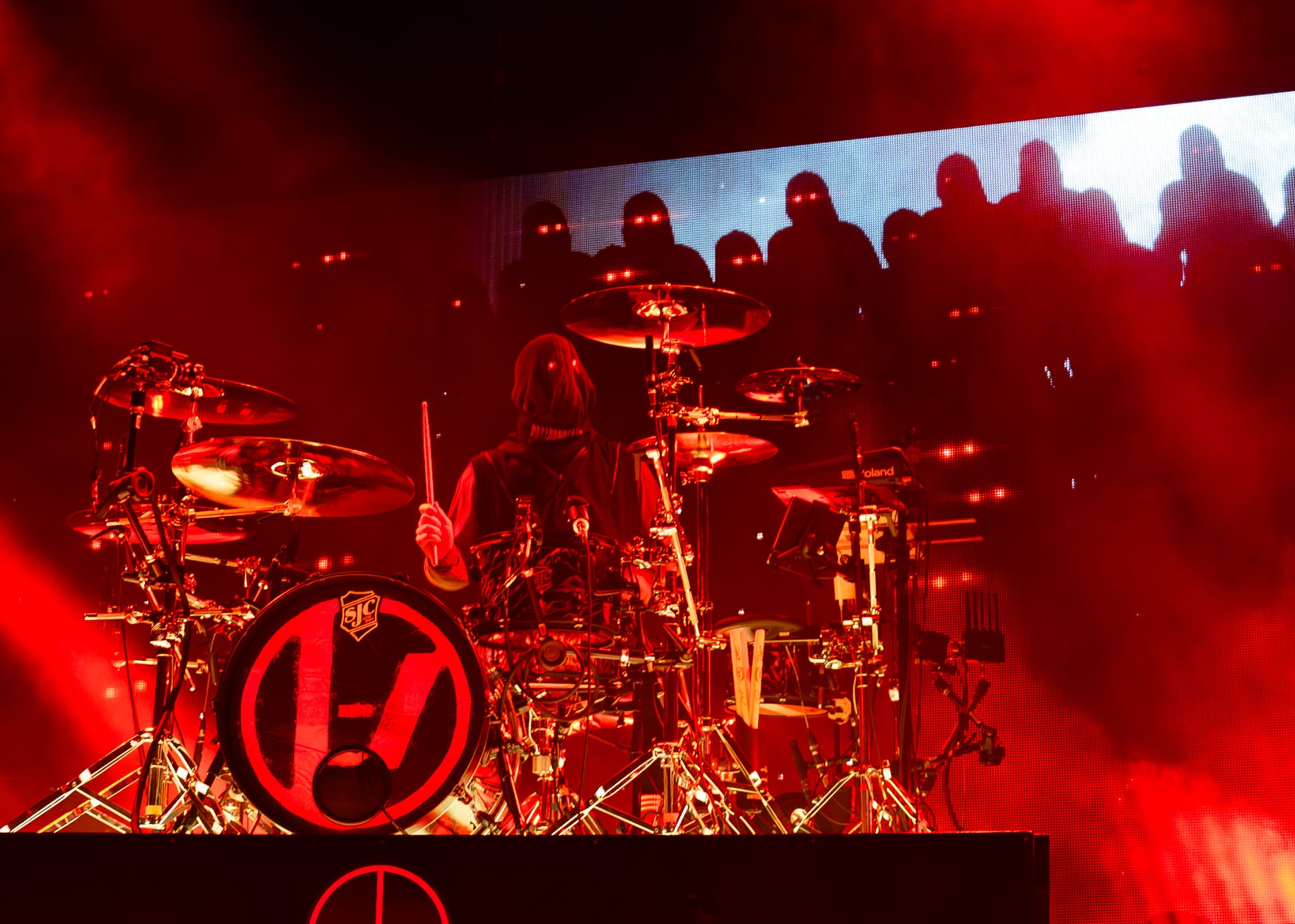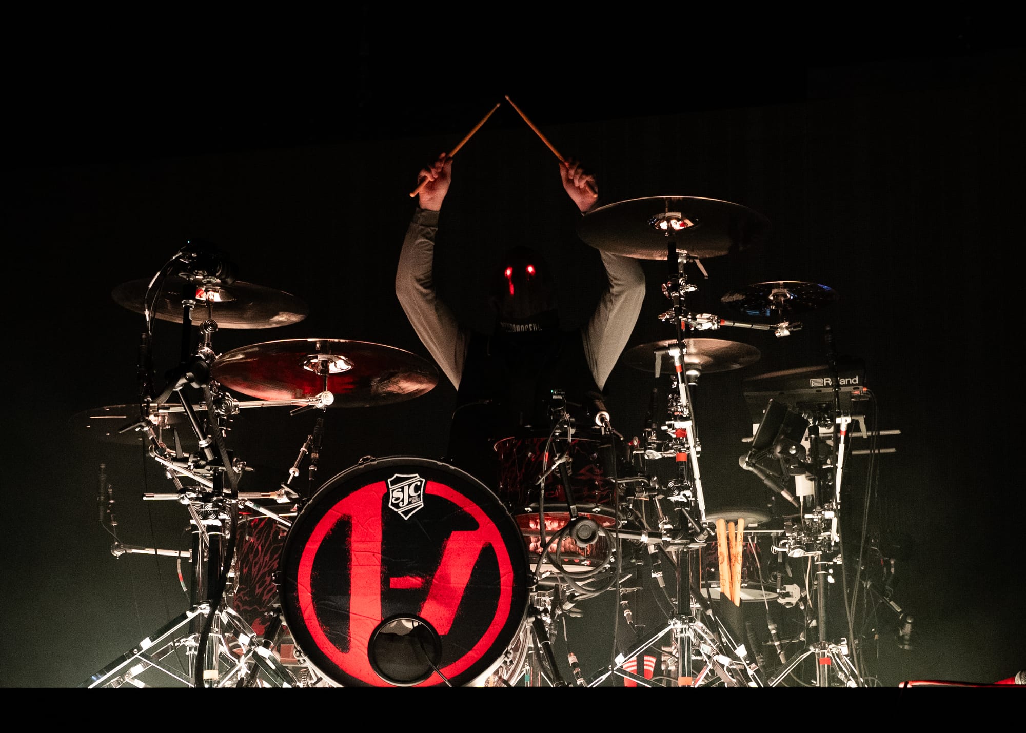 The moment the lights went out, the fans erupted in loud cheers and applause, as the stage bled out in red hues. Josh made his way behind his drumset, his face covered by a mask with only two piercing red lights hauntingly watching the audience. He started out with an impressive drum solo, setting the energy levels high for the entire night. Then the pyro went out and Tyler made a striking appearance by jumping off the piano and launching right into "Overcompensate".