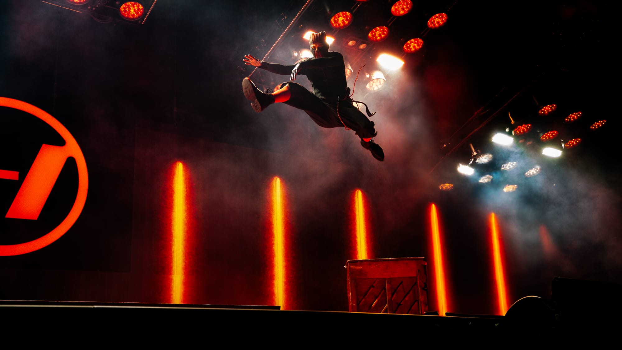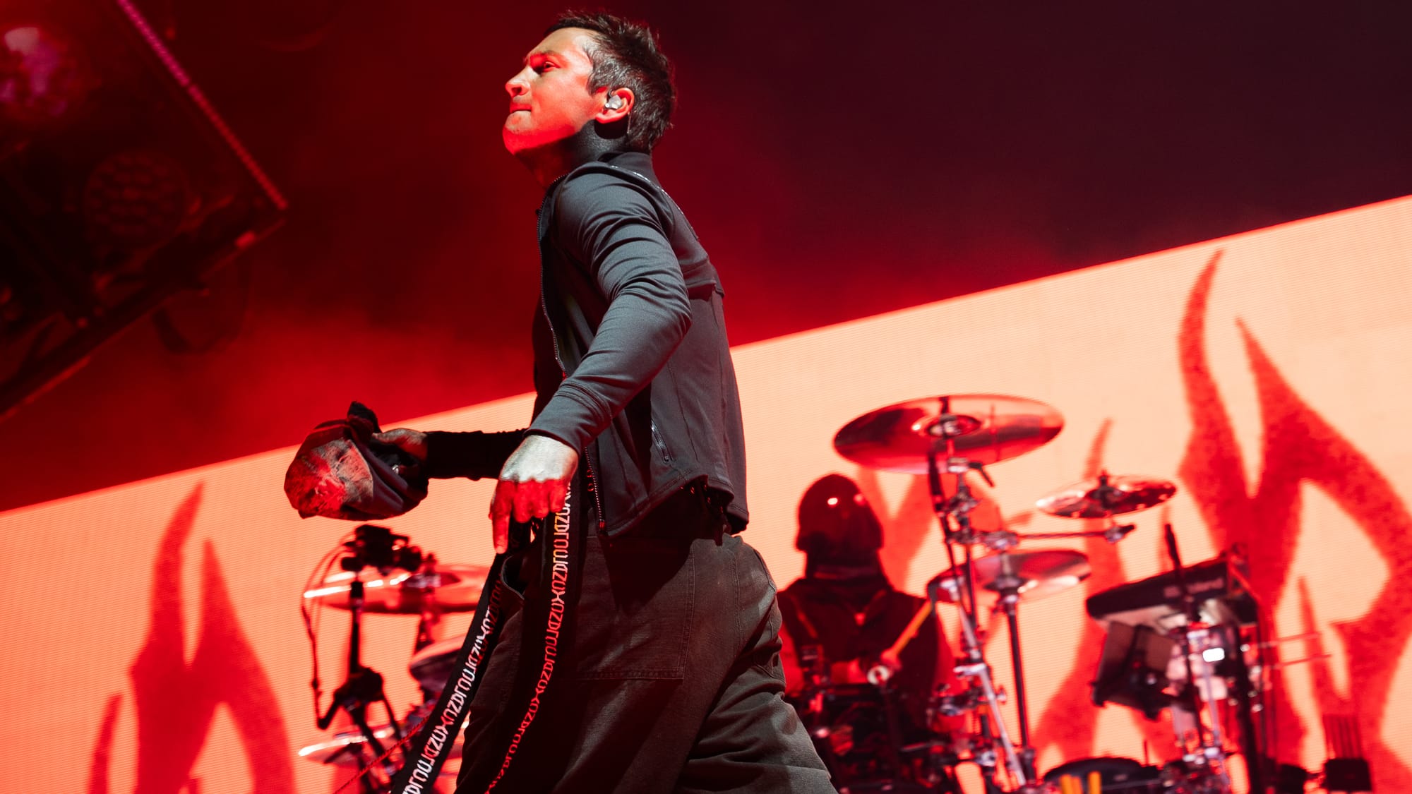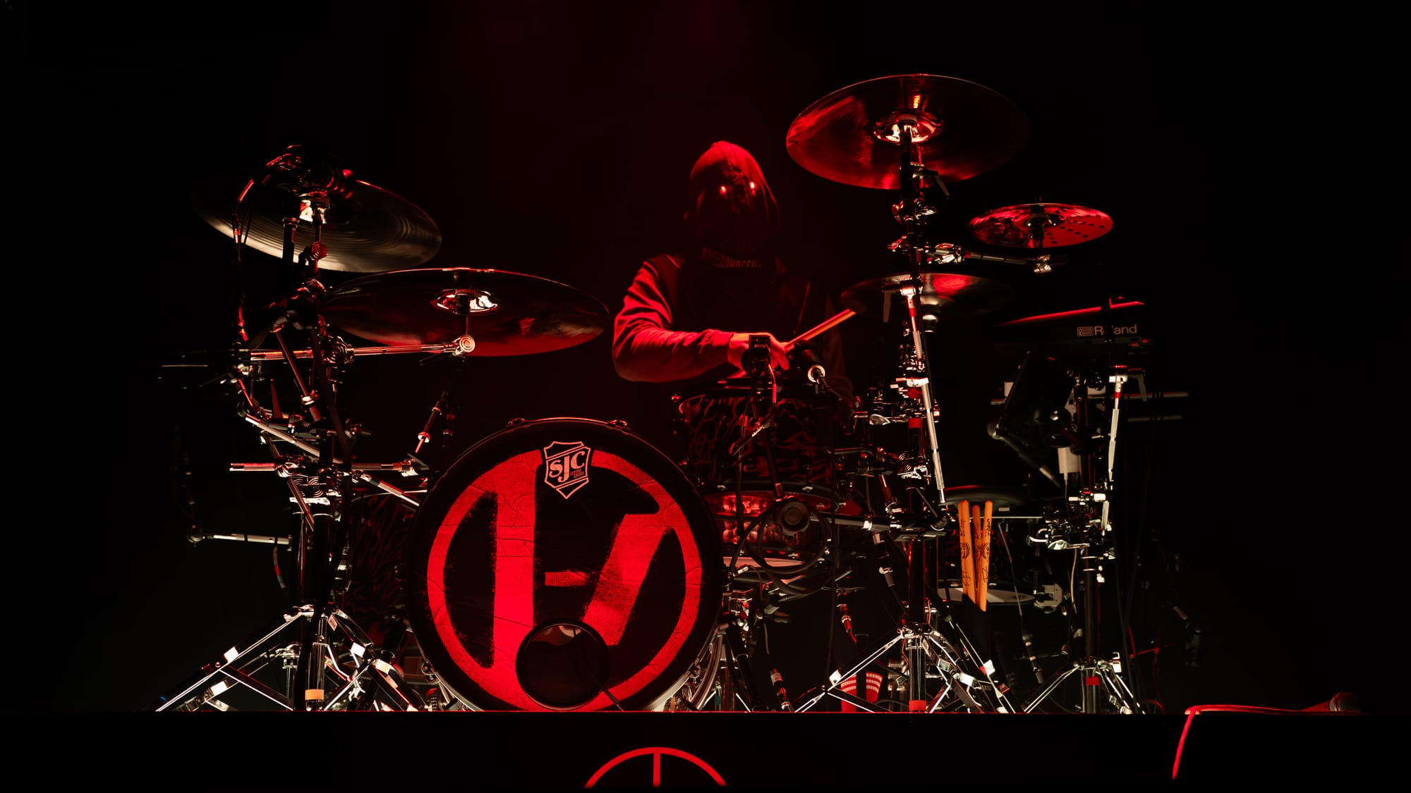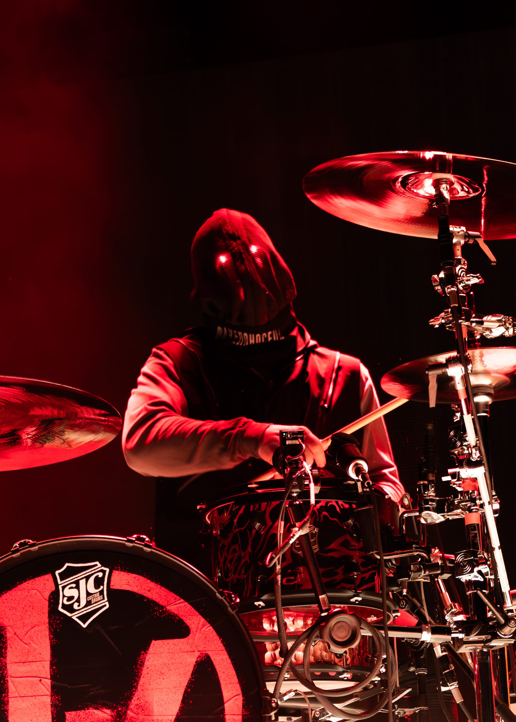 The moment the lights went out, the fans erupted in loud cheers and applause, as the stage bled out in red hues. Josh made his way behind his drumset, his face covered by a mask with only two piercing red lights hauntingly watching the audience. He started out with an impressive drum solo, setting the energy levels high for the entire night. Then the pyro went out and Tyler made a striking appearance by jumping off the piano and launching right into "Overcompensate".
