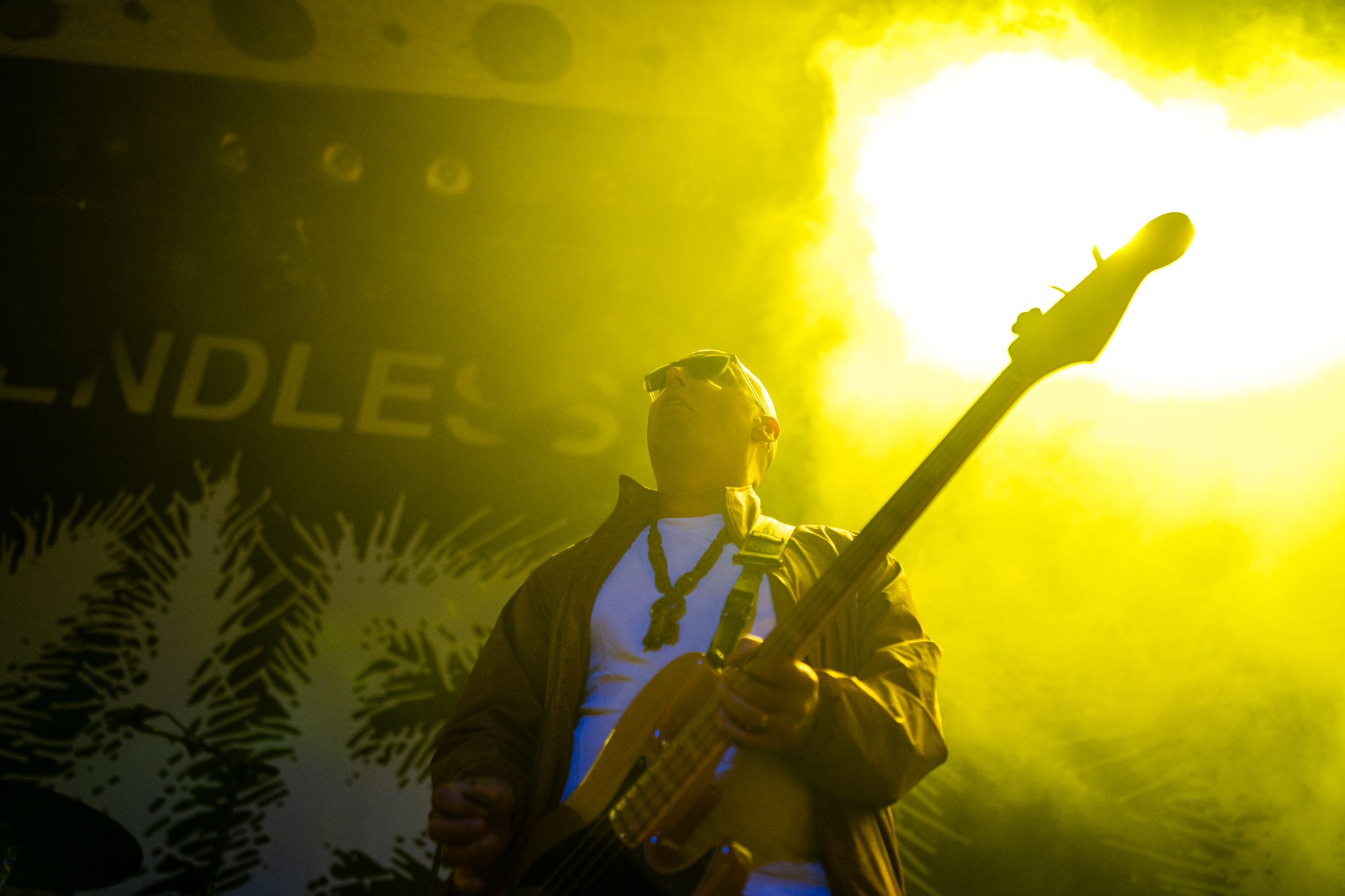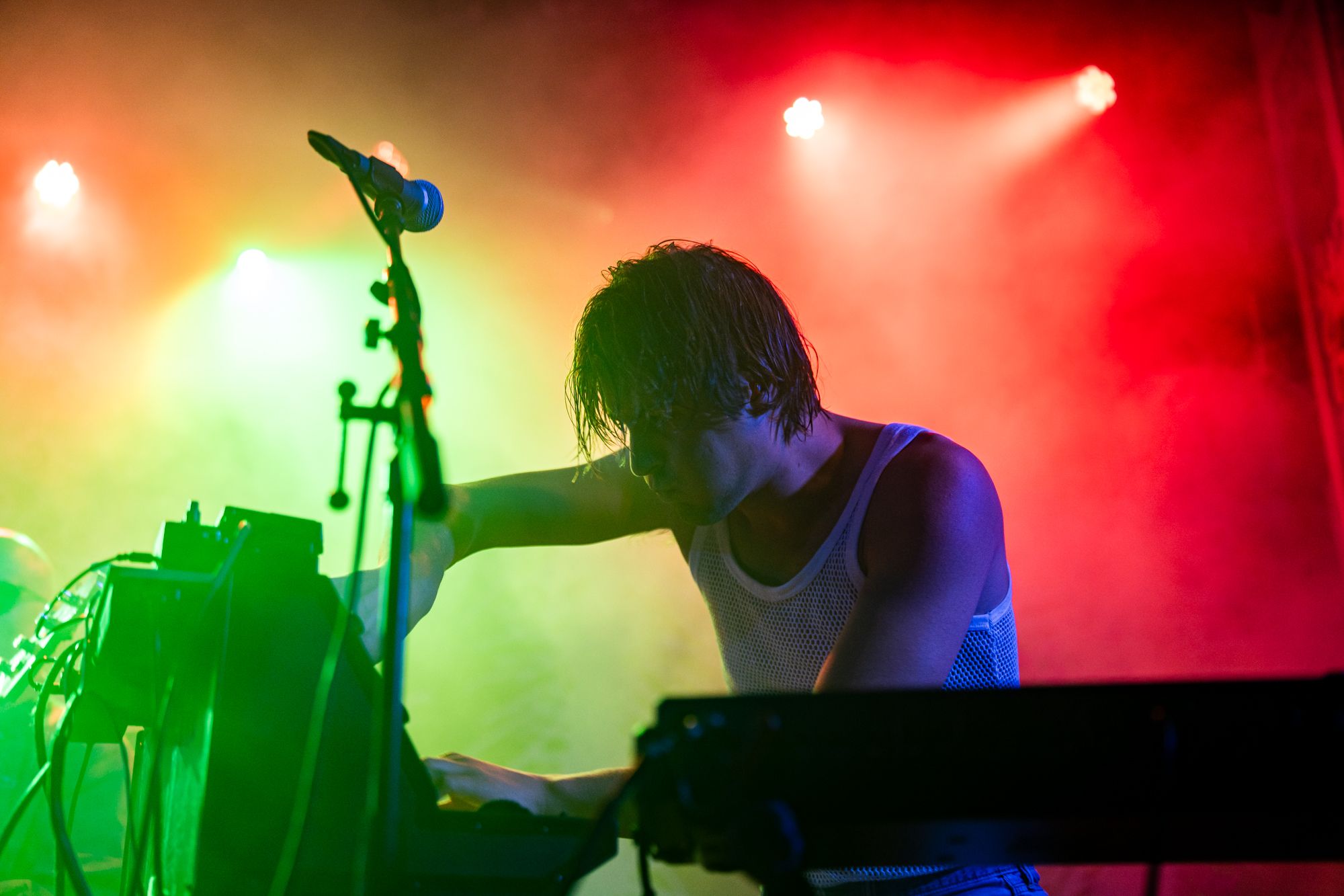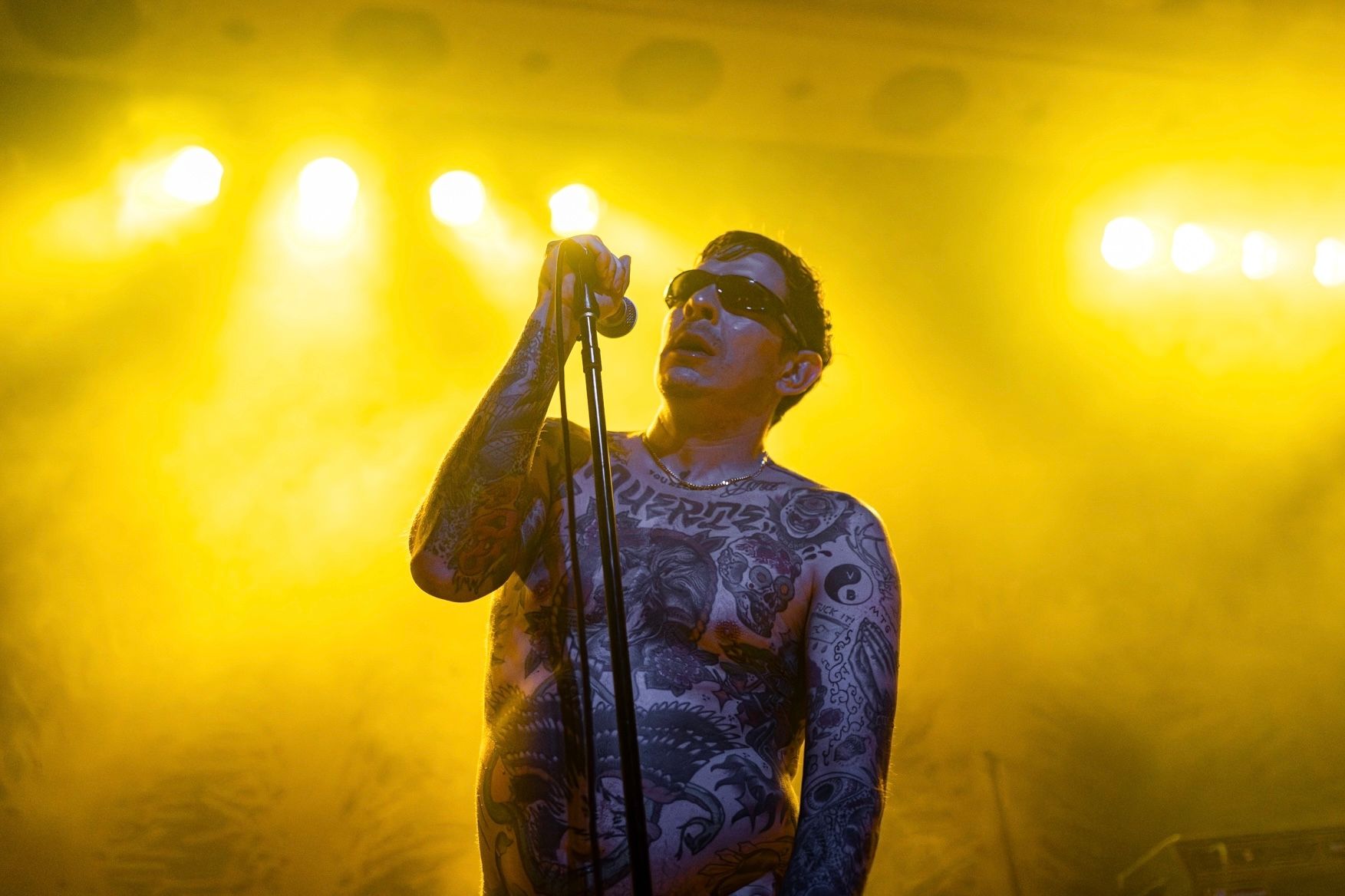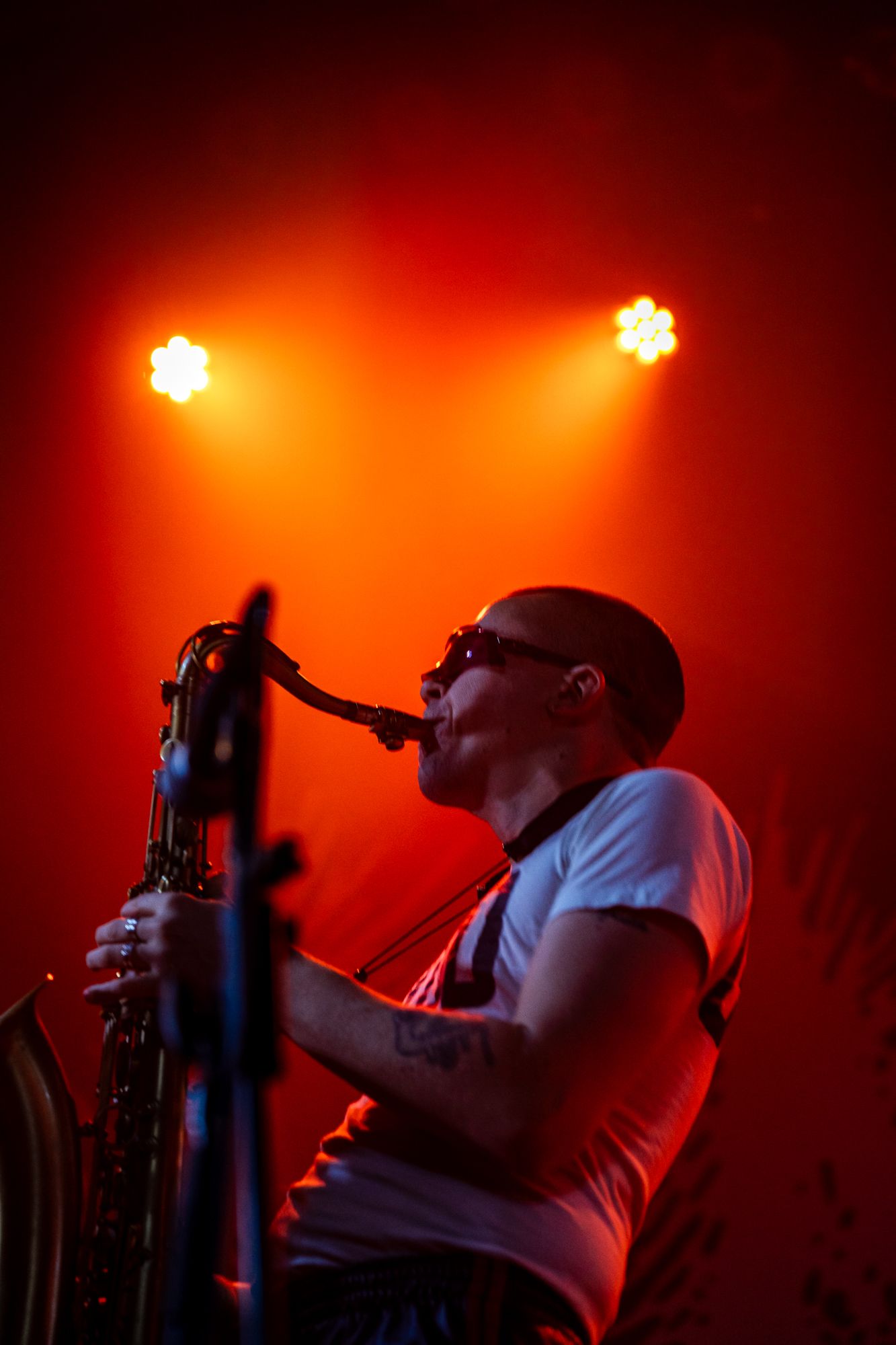 The theme of being anti-society and the breakdown of all social norms was a theme throughout the early part of the Viagra Boys' set. Their 2019 song 'Worms' touches on the futility of doing anything at all, because the same worms are going to eat us once we die no matter who we are. And while the popular meme of 'returning to monke' is usually nothing more than Reddit users expressing the desire for a simpler life, lead singer/songwriter/Ray Bradbury's Illustrated Man Sebastian Murphy builds the case to take that literally on 'Return To Monke' ("You can hang out and eat a banana/ You don't have to worryabout no current events/just rub a frog on your genitals/and stop paying your rent"). Followed up by their celebration of backward evolution 'Troglodyte', the Swedish sextet (rounded out with Henrik Höckert on bass, Tor Sjödén on drums, Oscar Carls on sax, Elias Jungqvist on keys, and Linus Hillborg on guitar) strutted and oozed their way through their own unique post-punk sound. With lyrics poking fun at everything from hyper-masculinity to right-wing fear mongering, only to engage in those very acts themselves (sometimes within the same song), part of the charm is the way they blur the line between what's an act and what's the sleazy truth, played up to maximum effect.