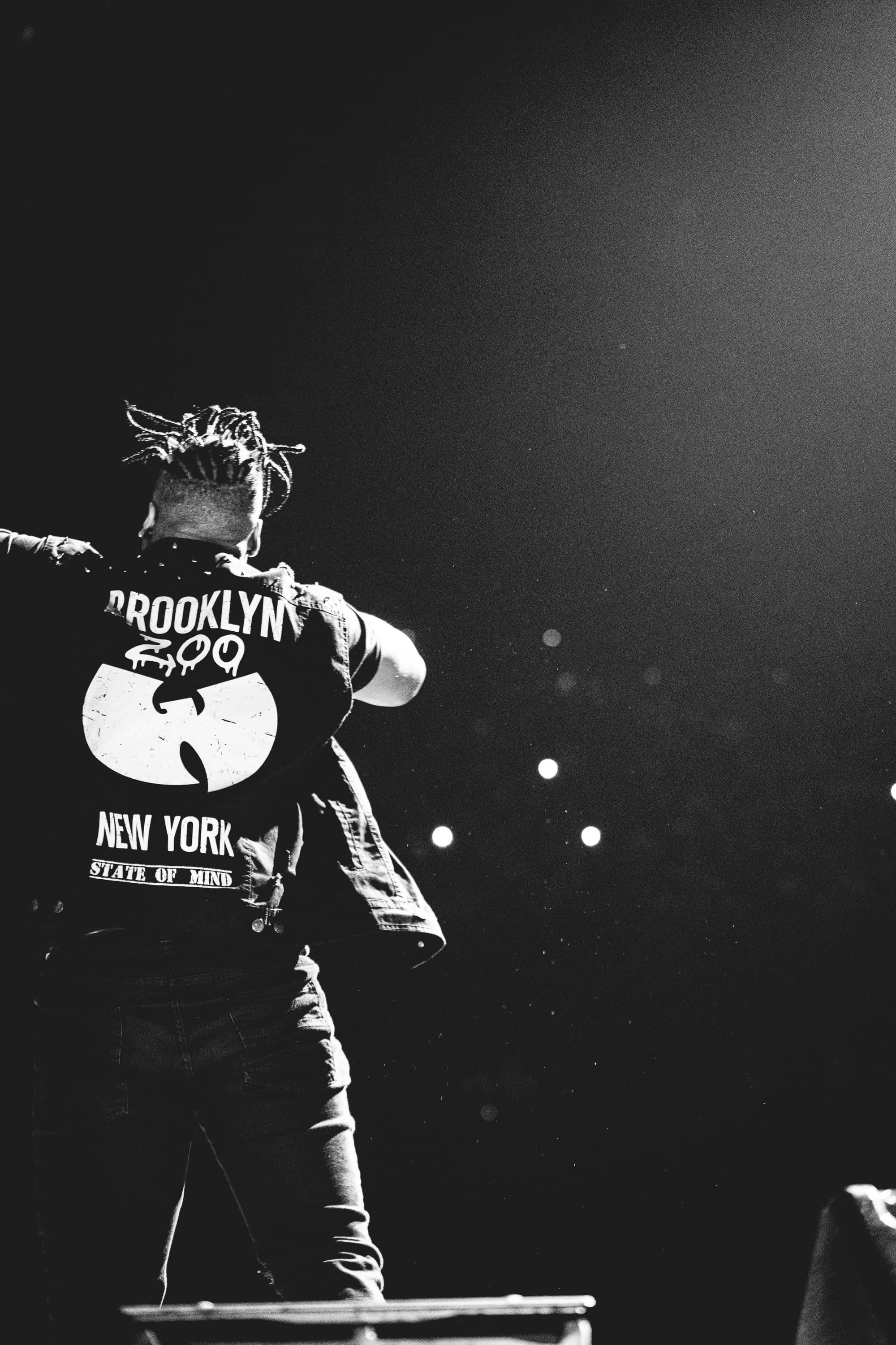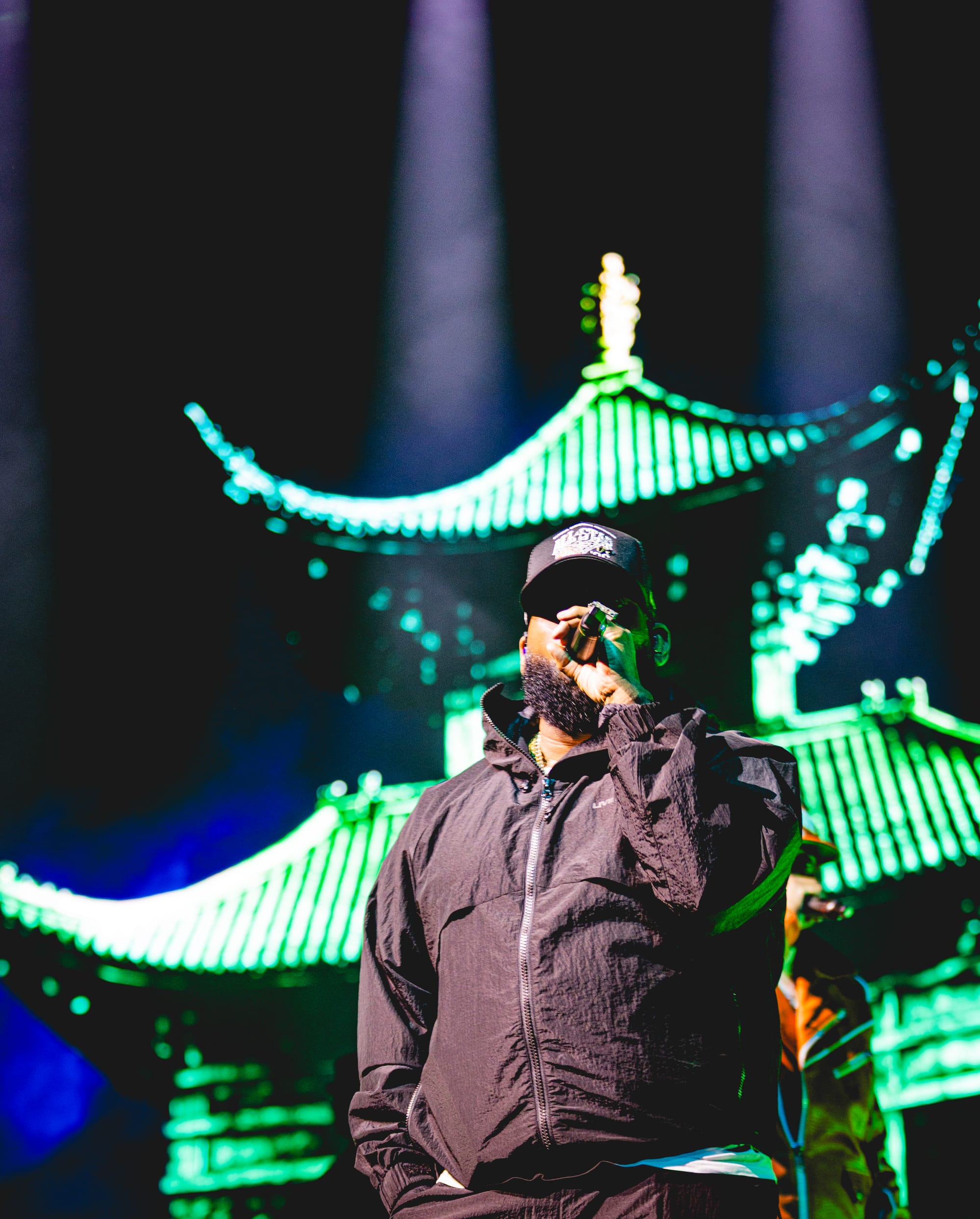 After collecting my photo pass, I made my way to the pit. A full-height, stage-wide curtain emblazoned with the Wu-Tang logo greeted us, while backing music reminiscent of 90s street basketball video games filled the arena.
