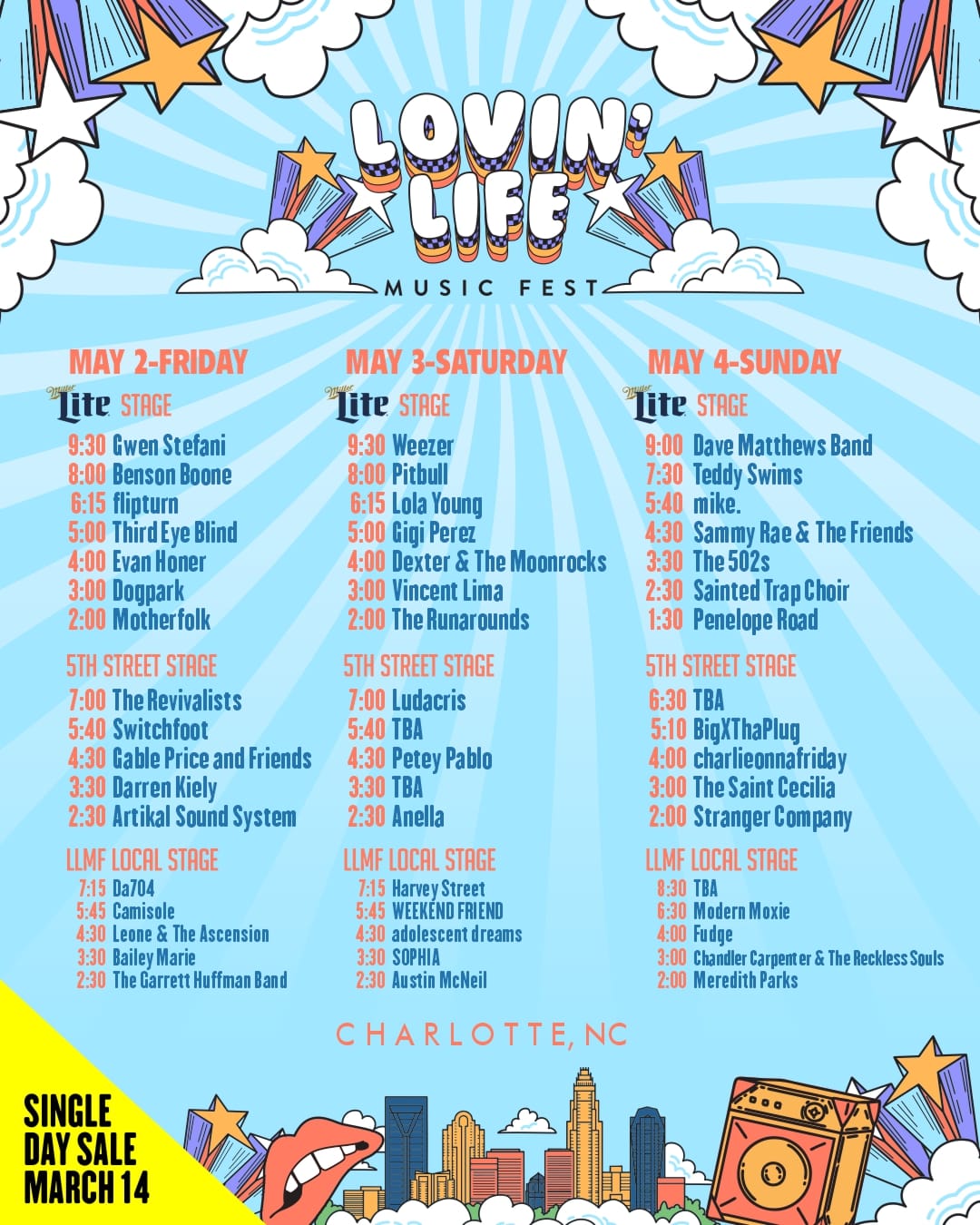 Lovin' Life Music Fest is an annual three-day music festival held in Charlotte, NC. The festival features a blend of musical genres across three stages, including national headliners, regional talent, and local artists. The festival was first held in 2024 and sold over 30,000 tickets, selling out well in advance of the event date.